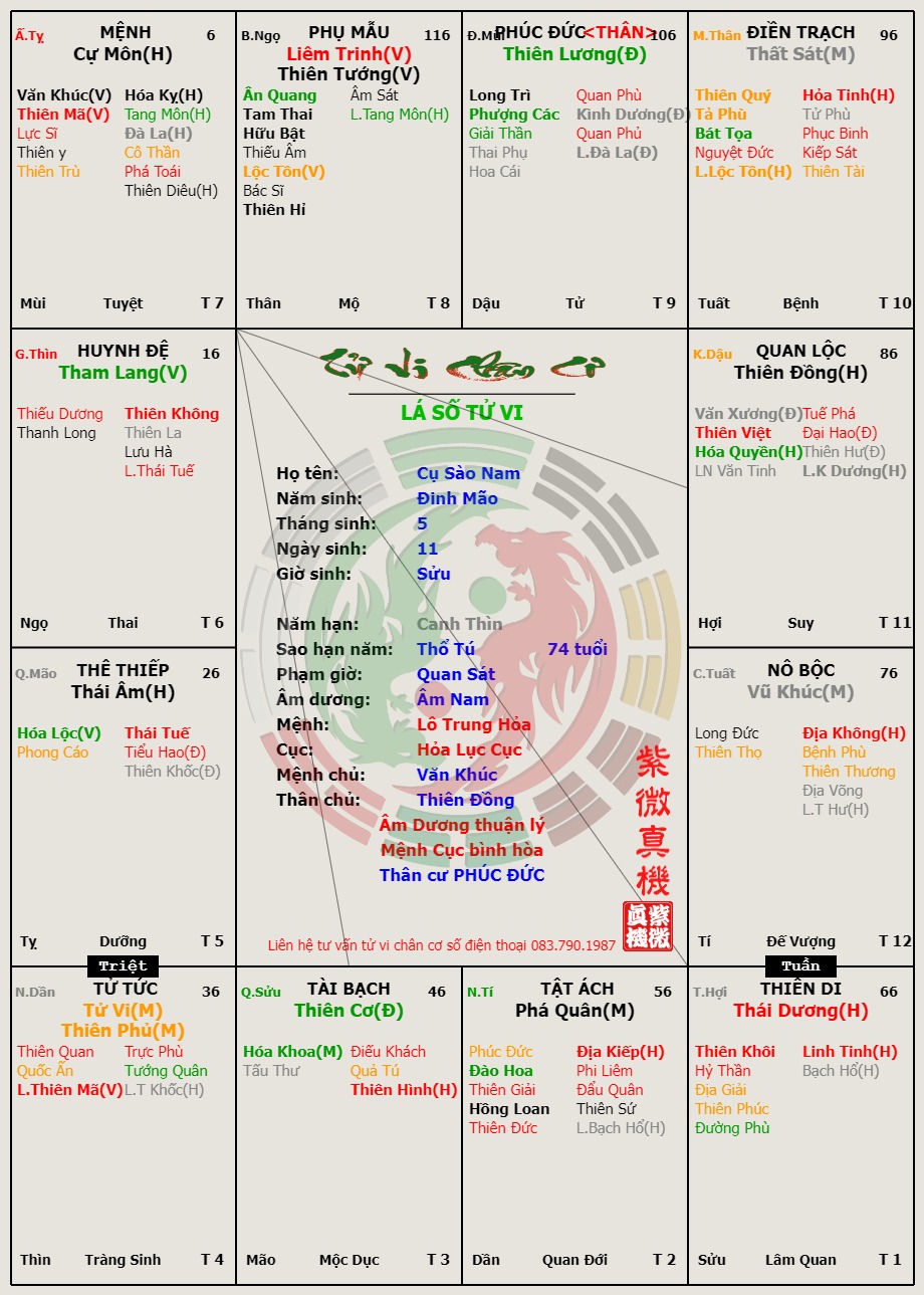 Cụ Sào Nam tuổi Đinh Mão sanh ngày 11 tháng 5 giờ Sửu thành danh một đại văn hào cách mạng nhờ bộ Riêu Xương Khúc ở Mệnh, nhất là Mã hợp cảnh bền gan cùng tuế nguyệt. Thân cụ đắc Thiên Lương, Long Phượng giáp Thai Toạ, Quang Quý trúng cách nên cụ ở hoàn cảnh nào cũng bình tĩnh uy nghiêm điềm đạm lo toan việc nghĩa. Tả Hữu của cụ ở trường hợp lỡ bước (Tả ở Thân Hữu ở Ngọ ) nên cụ không mấy đa dạng tham bàn thêm mọi sự thế.