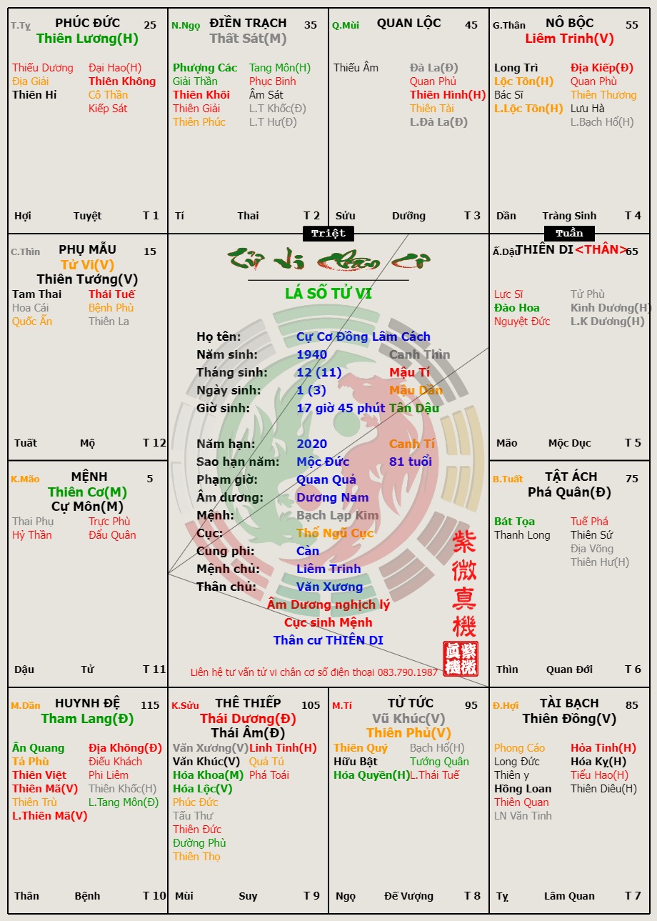 Cung Mệnh có Cự Môn và Thiên Cơ tại Dậu, Dậu (Kim) đến sinh Cự Môn (Thủy), mà Thủy lại sinh Thiên Cơ (Mộc), nhưng Thiên Cơ (Mộc) tại cung vị Kim là không có căn cơ, theo thủy phiêu đãng, lại gặp Hóa Ky thủy tinh, thủy thế càng vượng, dẫn đến cả đời phiêu bạt, ly hương phát triển. Dù cho có cát hóa tinh cũng là "Cự Cơ tại Dậu hóa cát, dù có Tài Quan cũng không vinh".