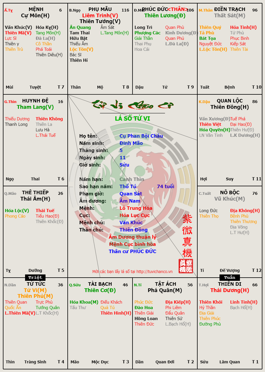Tuổi Đinh Mão mà gặp Cự Môn, Hóa Kỵ thủ Mệnh là cái thế nguy nan của người có số, nhưng còn nhiều nợ đời phải trả nên hóa công đặt cho cái thế quân bình về mạng sống ở Tỵ cung nên cụ trải qua bao sự nguy khốn mà vẫn trường tồn cùng Tổ Quốc đến 74 tuổi.