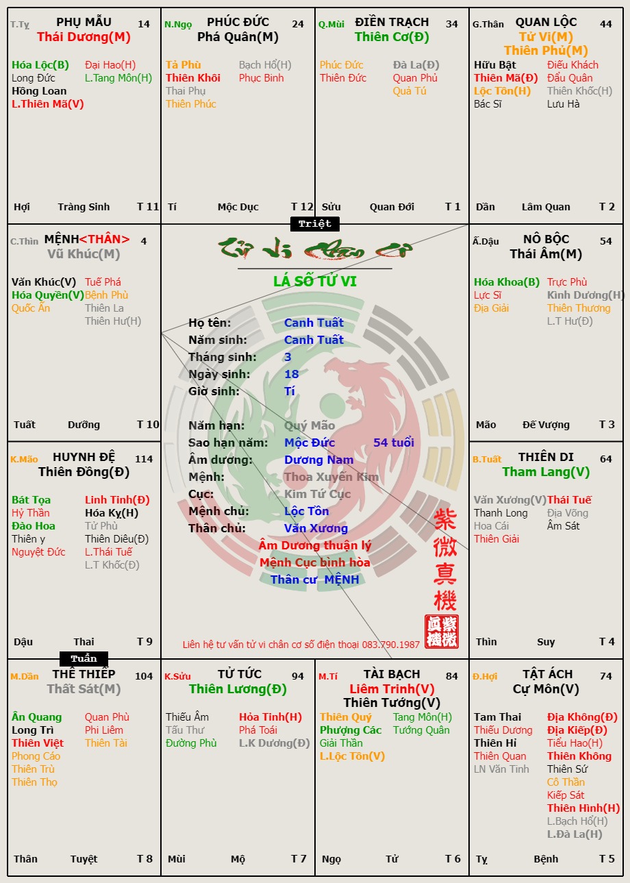 b- Tuổi Canh Tuất Kim Mệnh cũng Thân Mệnh đồng cung, được tam hóa liên châu tô màu ở chỗ thanh thiên bạch nhật (cung Thìn) đắc Vũ Khúc, Thiên Mã cũng Kim, so với Mệnh Giáp Tý thì nặng cân hơn quá nhiều, lại được Kim Cục, ấy thế mà thua xa Giáp Tý đến muôn vạn dặm.