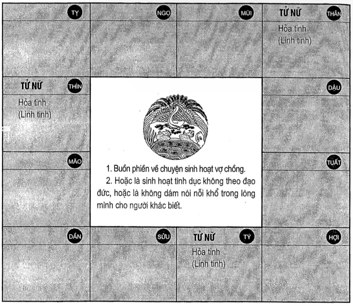 11. Cung Tử Tức - Hóa Kỵ nhập cung Phu Thê xung cung Điền Trạch, có thể hiếm muộn đường con cái, mà cho dù có con thì cũng ắt ly hôn mà con cái theo mẹ, nên lại không có người sau này phụng dưỡng chăm lo.