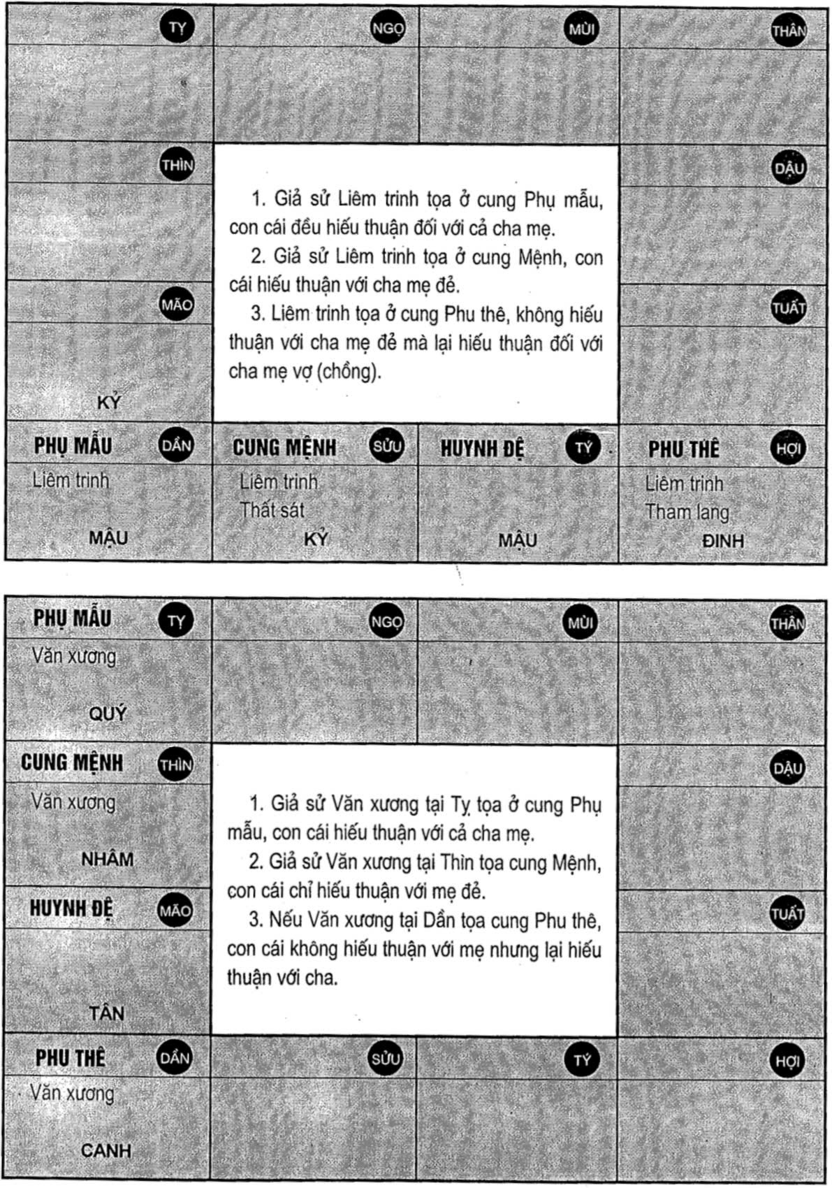 1. Can cung của cung Tử Tức - Hóa Kỵ nhập cung Phụ Mẫu, con cái đều hiếu thuận đối với cả cha và mẹ.
