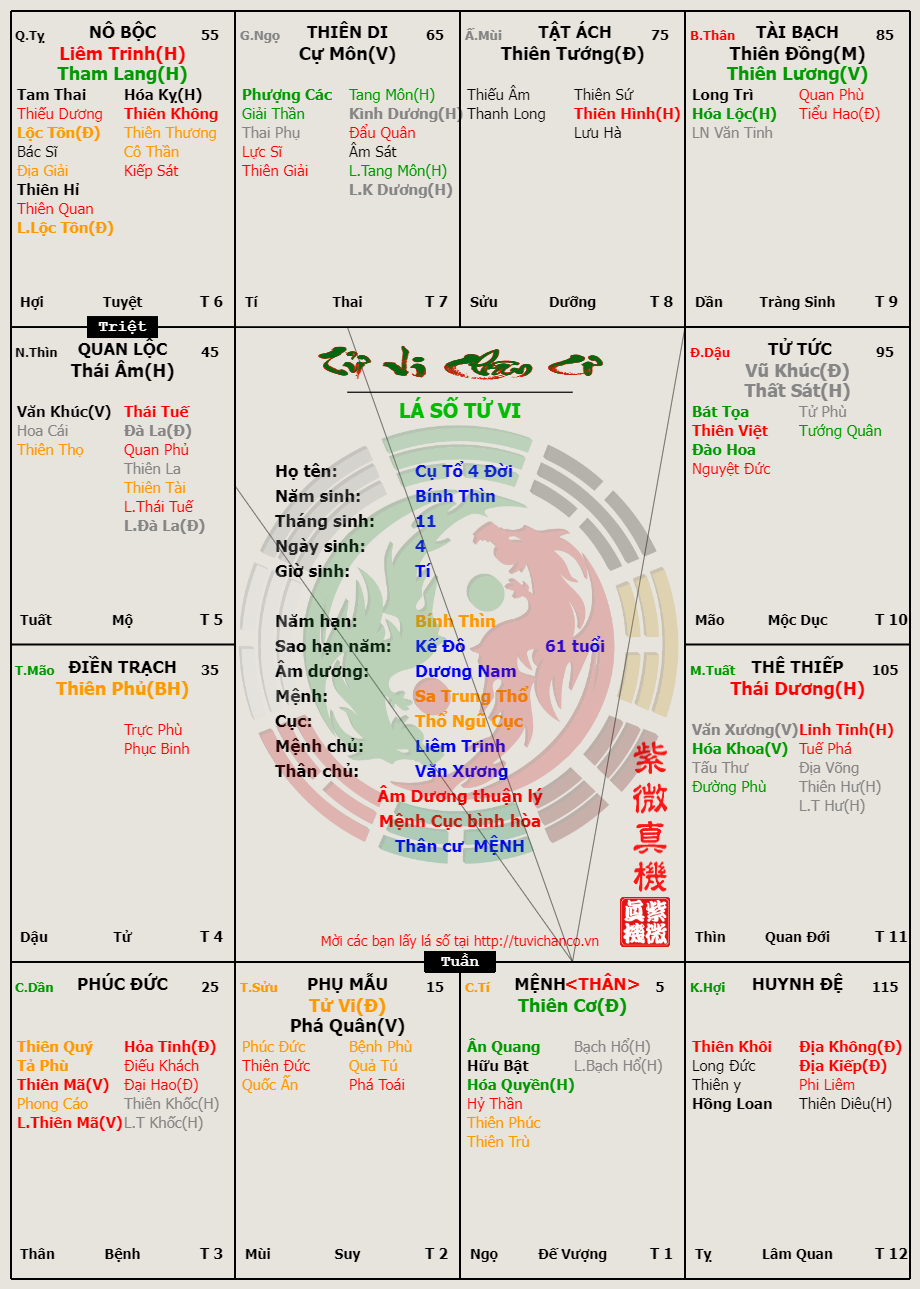 Lá số Tử Vi - tuổi Bính Thìn, sinh ngày 4, tháng 11, giờ Tí