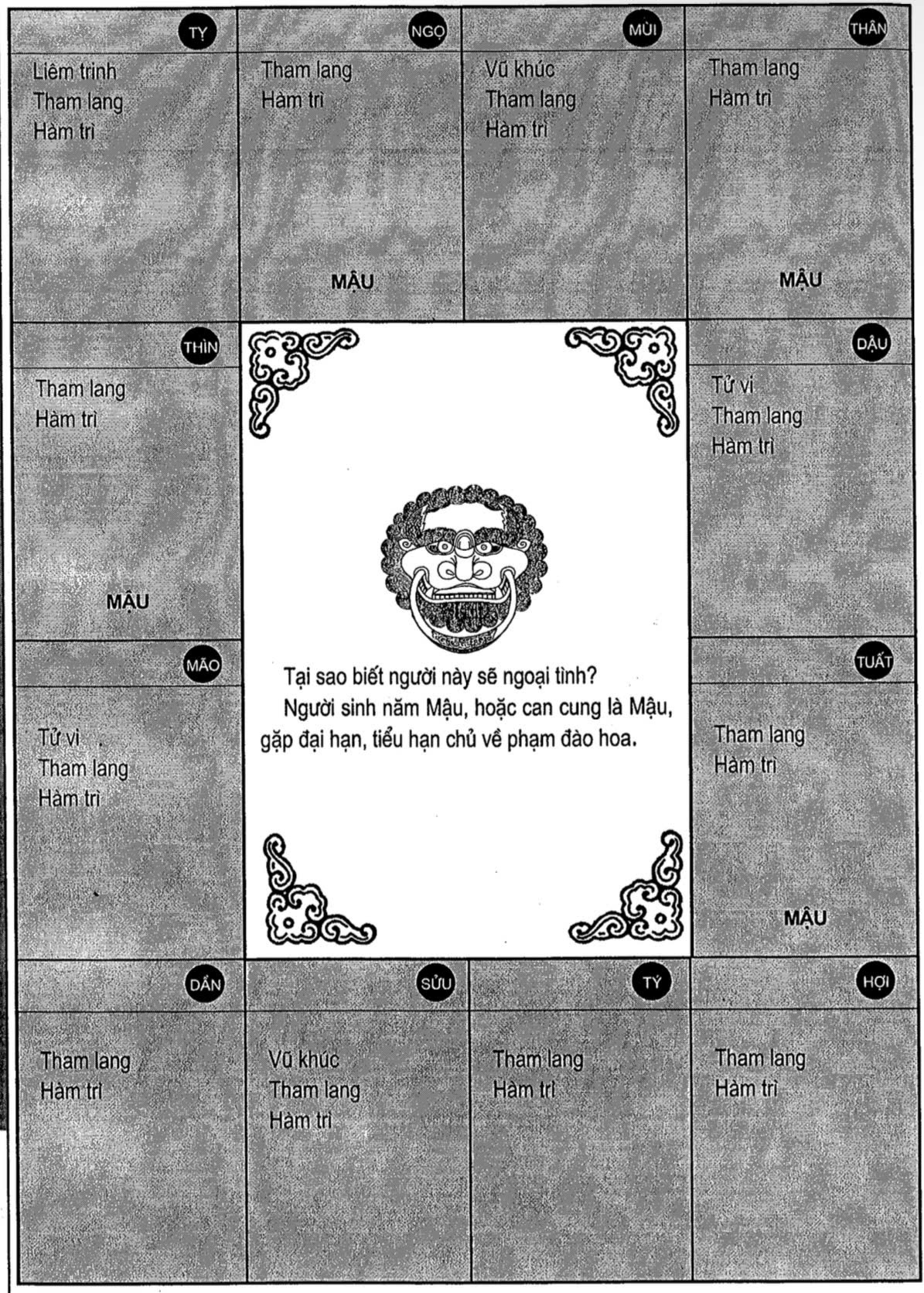 Phàm là trong Mệnh bàn, bất luận là Tham Lang ở cung nào đi chăng nữa mà chỉ cần có Hàm Trì đồng cung thì cho là dù nam hay nữ trong cuộc đờ ắt sẽ có lần ngoại tình.