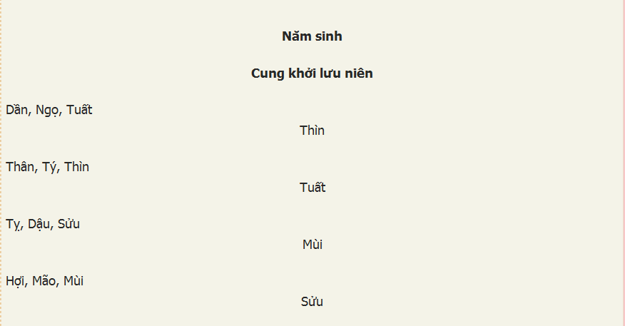 Ví dụ: 3 tuổi Hợi, Mão hay Mùi thì ghi chữ Hợi, chữa mão hay chữ Mùi ở cung Sửu.
