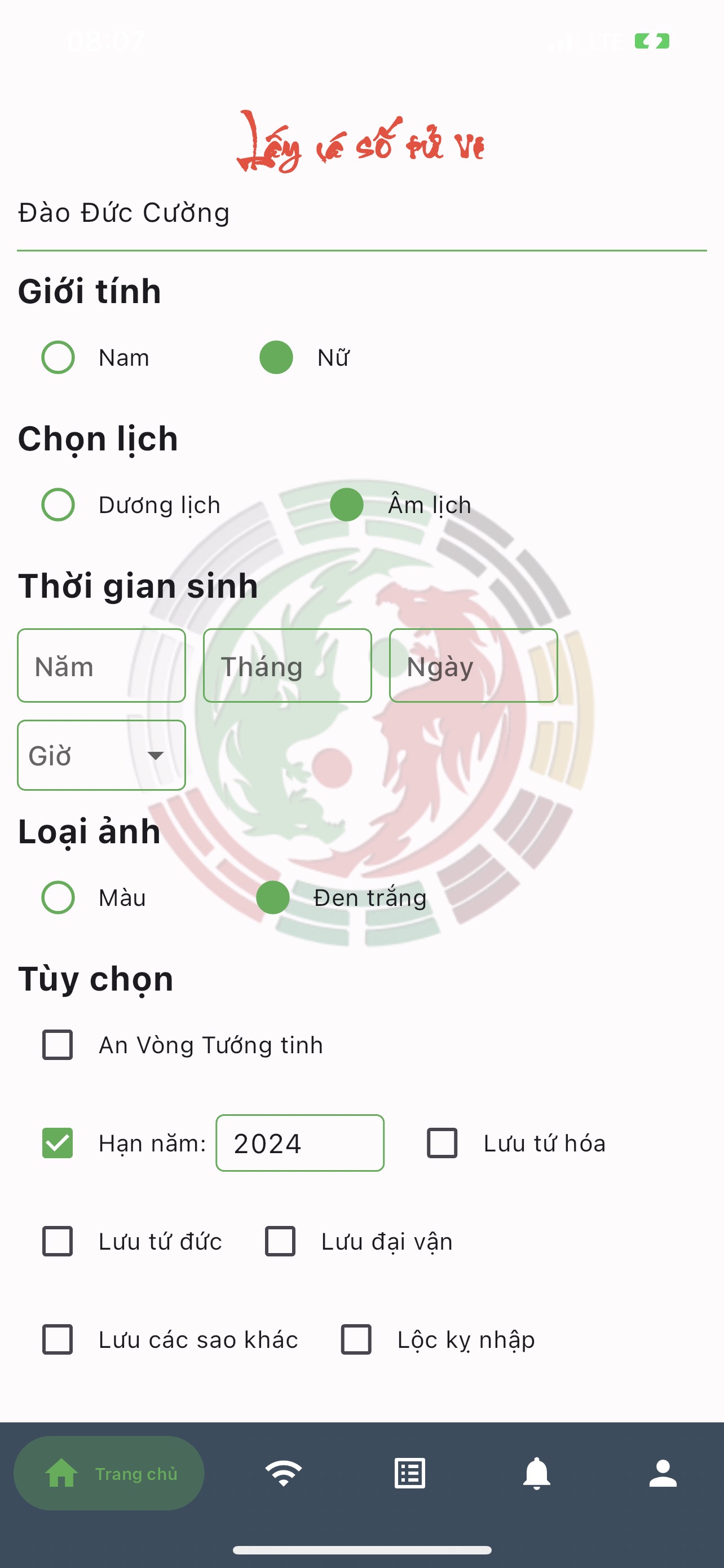 Mục trang chủ: phần này chủ yếu để quý bạn có thể lập lá số Tử Vi trên App một cách thuận tiện dễ dàng thay vì phải vào website lấy lá số Tử Vi như trước đây (hình minh họa 6).