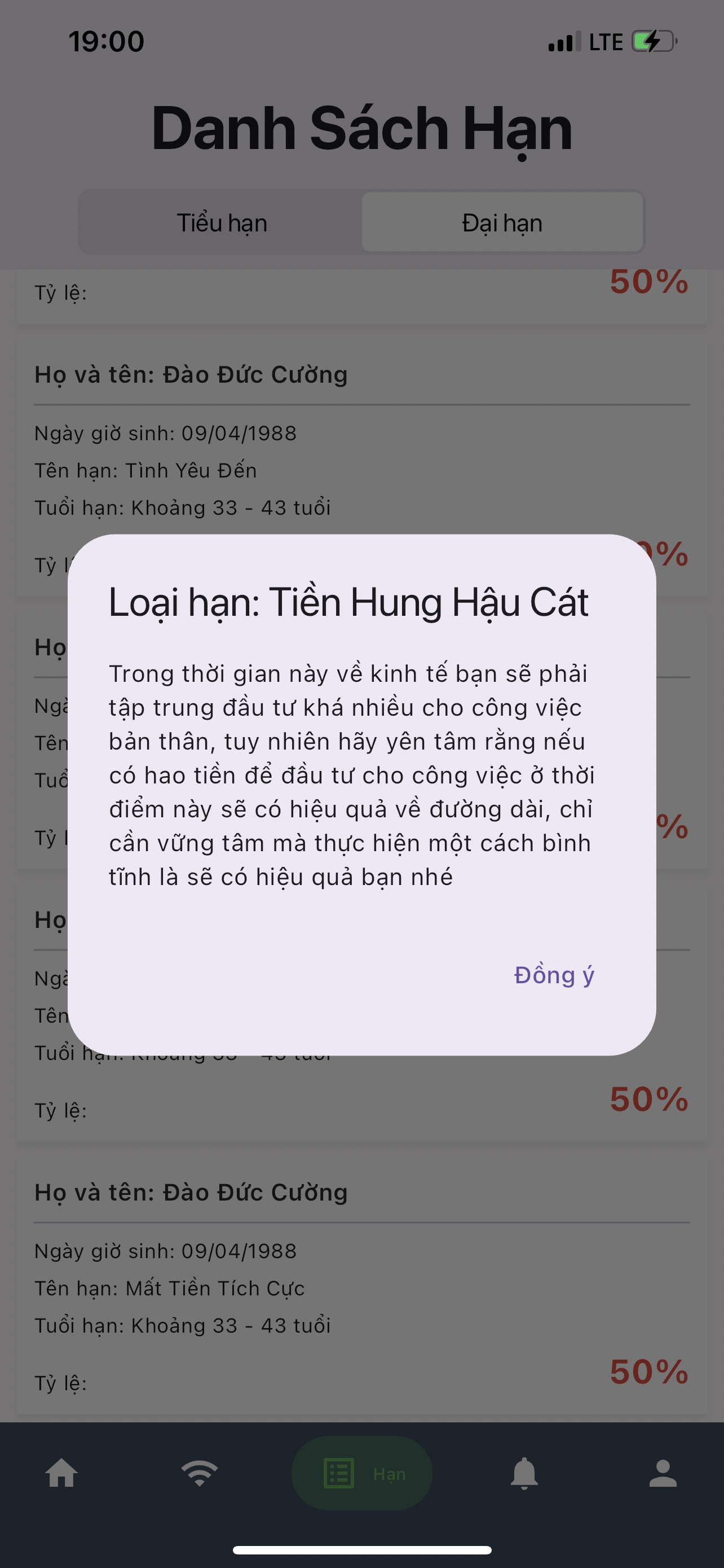 Mục Tiểu Hạn - Đại Hạn: đây sẽ là mục lưu trữ và dự báo các vận hạn của quý bạn từ quá khứ đến tương lai trong cả một đời người. Ở mục này chỉ dành riêng cho quý bạn vừa là Hội Viên Vip vừa muốn đăng ký thêm dịch vụ Quản Trị Cát - Hung do chính Thầy Đào Đức Cường sẽ trực tiếp xử lý trên hệ thống và đẩy lên App cho quý bạn được theo dõi lịch sử vận hạn của quý bạn theo hình minh họa 8.