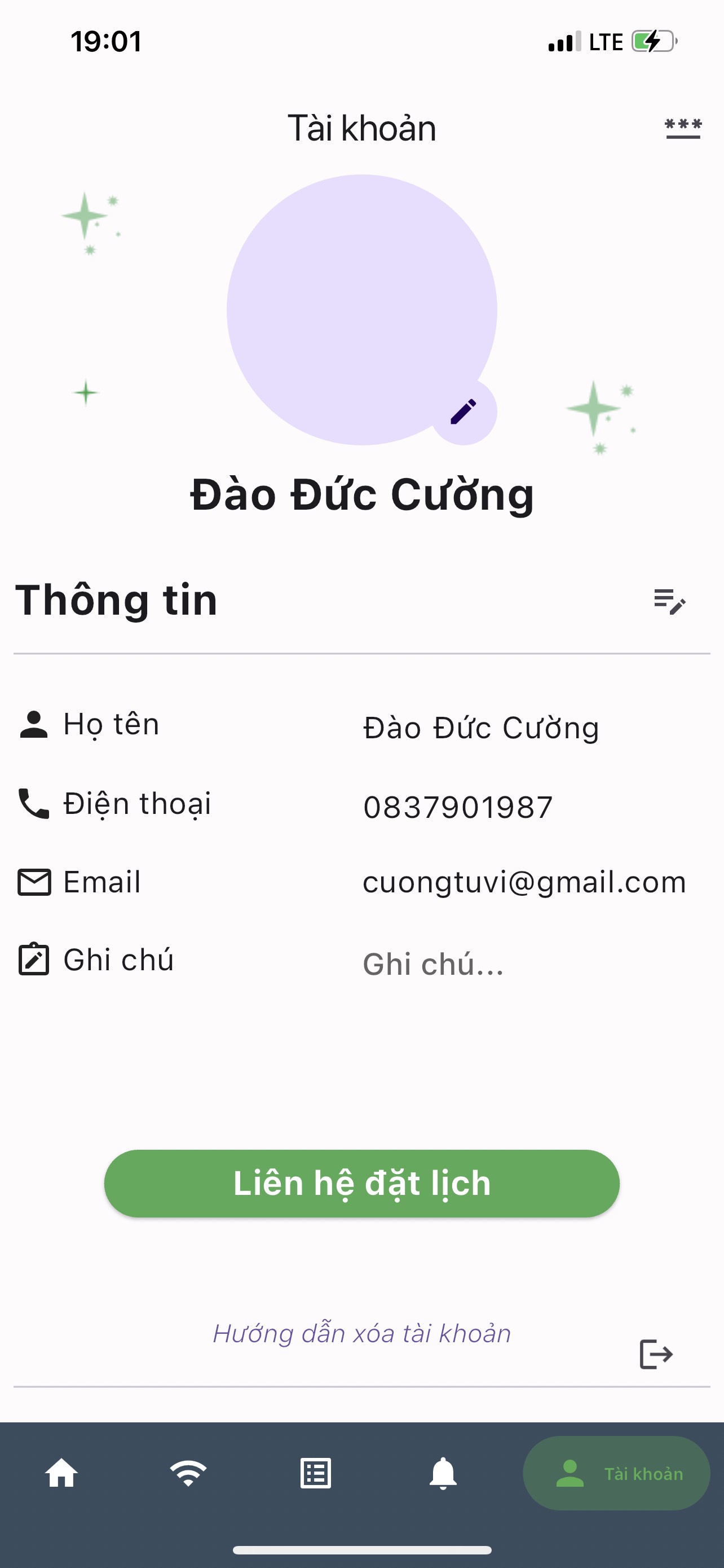 Mục Tài Khoản: ở mục này quý bạn có thể sửa lại thông tin cá nhân trên tài khoản như họ tên, số điện thoại, địa chỉ Email, ghi chú, mật khẩu tài khoản và có thể liên hệ đặt lịch tư vấn Tử Vi trực tiếp Thầy Đào Đức Cường sẽ tư vấn cho quý bạn chi tiết về lá số Tử Vi của bạn cũng như những việc bạn cần thay đổi và cần lưu ý trong lá số của mình (hình minh họa 10).