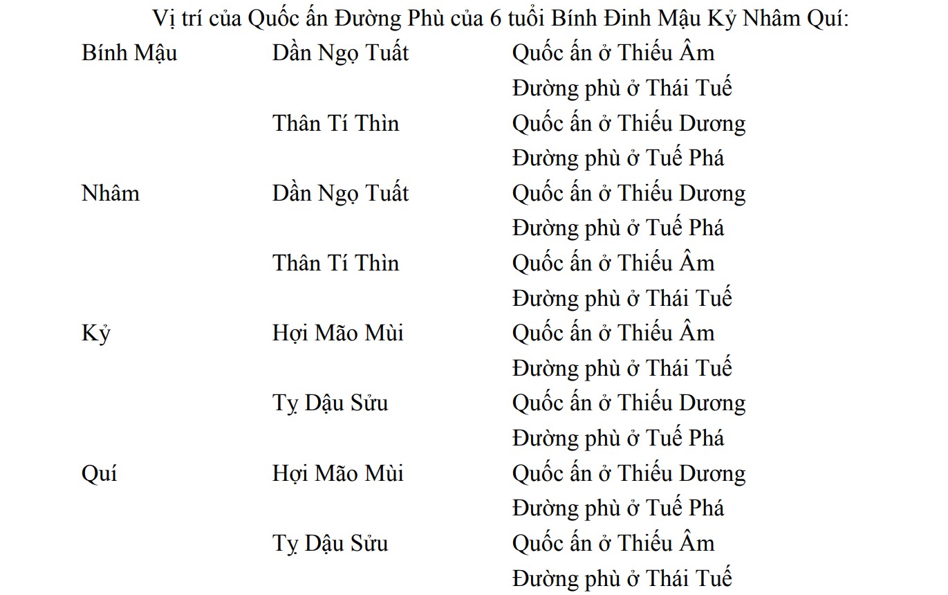 Đối với 6 tuổi Bính, Đinh, Mậu, Kỷ, Nhâm, Quý, Lộc tồn đứng ở vị trí nghịch lý âm dương. Đường Phù đứng lên lãnh vai trò bảo đảm cho những khả năng Thái Tuế và Tuế Phá vì chí khí hiên ngang được phần nào danh dự thụ hưởng. Còn Quốc Ấn hoàn toàn miên man ở Thiếu Dương hay Thiếu Âm là những vị trí chìm đắm thua thiệt. Nhưng dầu gì cũng là Quốc Ấn, một chứng từ vẫn có một giá trị bảo đảm bằng một điều khoản nào.