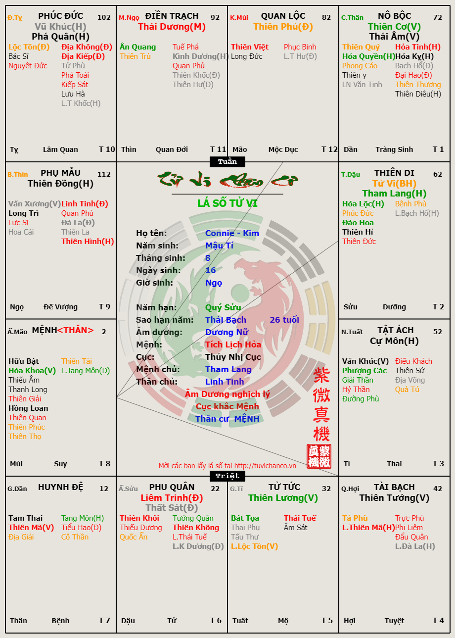 Lá số Tử Vi - Nghệ Sĩ Connie - Kim