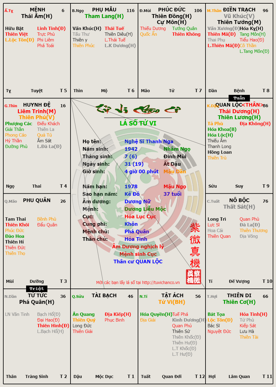 Lá số Tử Vi nghệ sĩ Thanh Nga