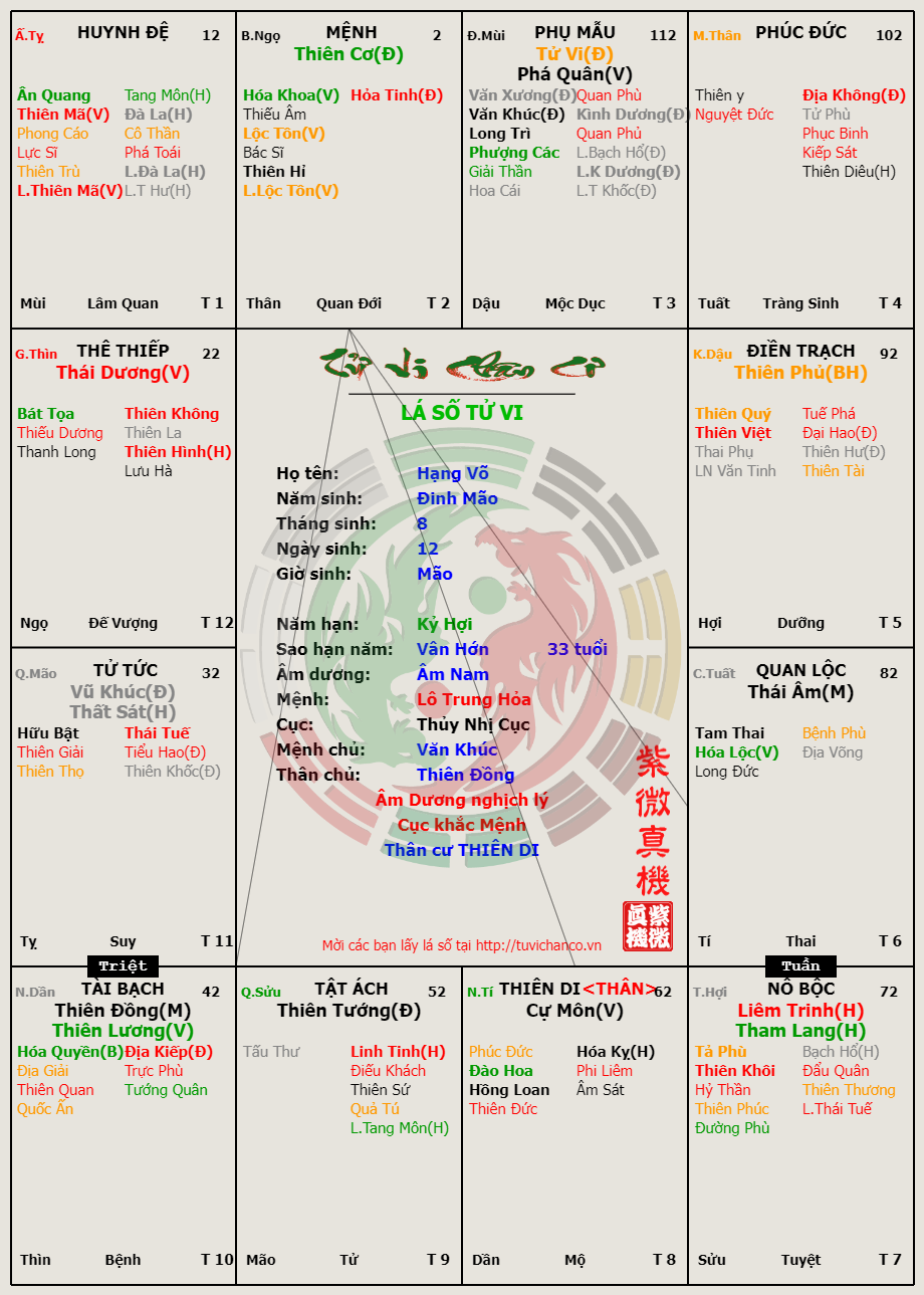 Cung Mệnh đóng ở Ngọ và Thân Mệnh đóng ở Tý là Cung Thiên Di. Cung Mệnh thì có Quan Đới, Bác Sĩ, Thiếu Âm, hai tốt một xấu: Số trên trung bình. Mệnh ở Ngọ, Hoa Cái ở Mùi, Thiên Mã ở Tị, là cách "Tiền Cái Hậu Mã" nghĩa là trước lọng sau ngựa là số tốt vì như ông Quan cưỡi ngựa che tàn.