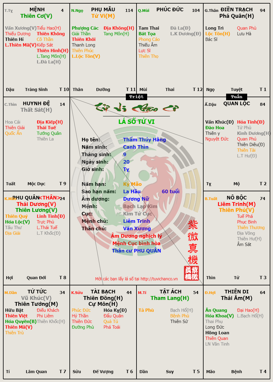 Lá Số Tử Vi Nghệ Sĩ Thẩm Thúy Hằng