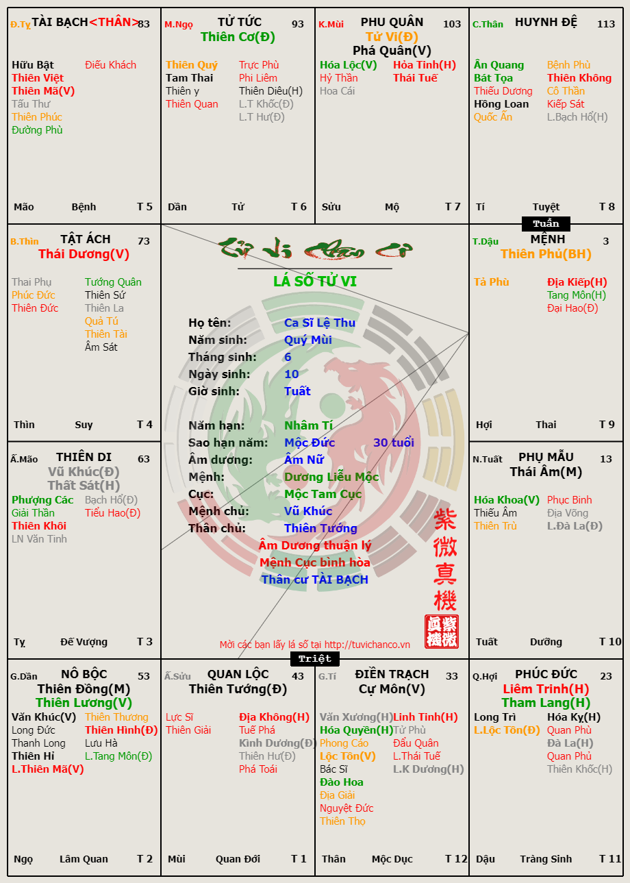 Lá số Tử Vi - Ca Sĩ Lệ Thu