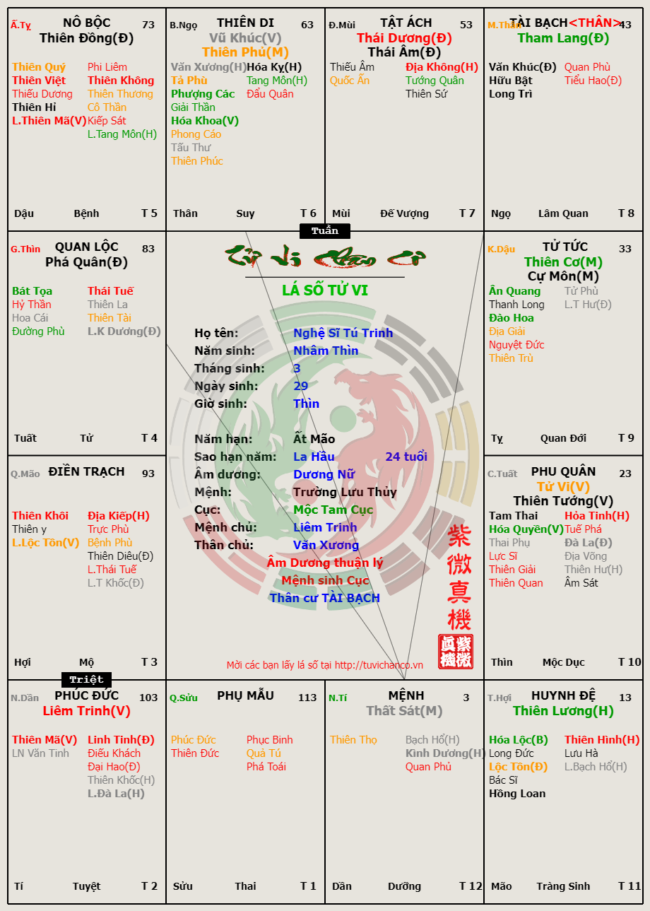 Lá số Tử Vi - Nghệ Sĩ Tú Trinh