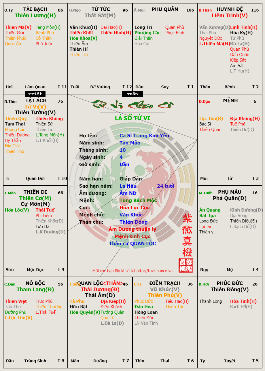 Lá số Tử Vi - Ca sĩ Trang Kim Yến