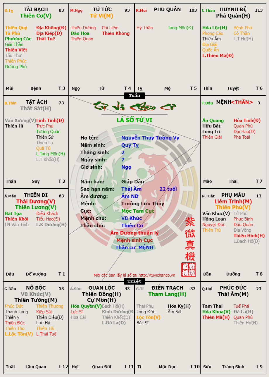 Lá số Tử Vi - Nữ Minh Tinh Nguyễn Thụy Tường Vi