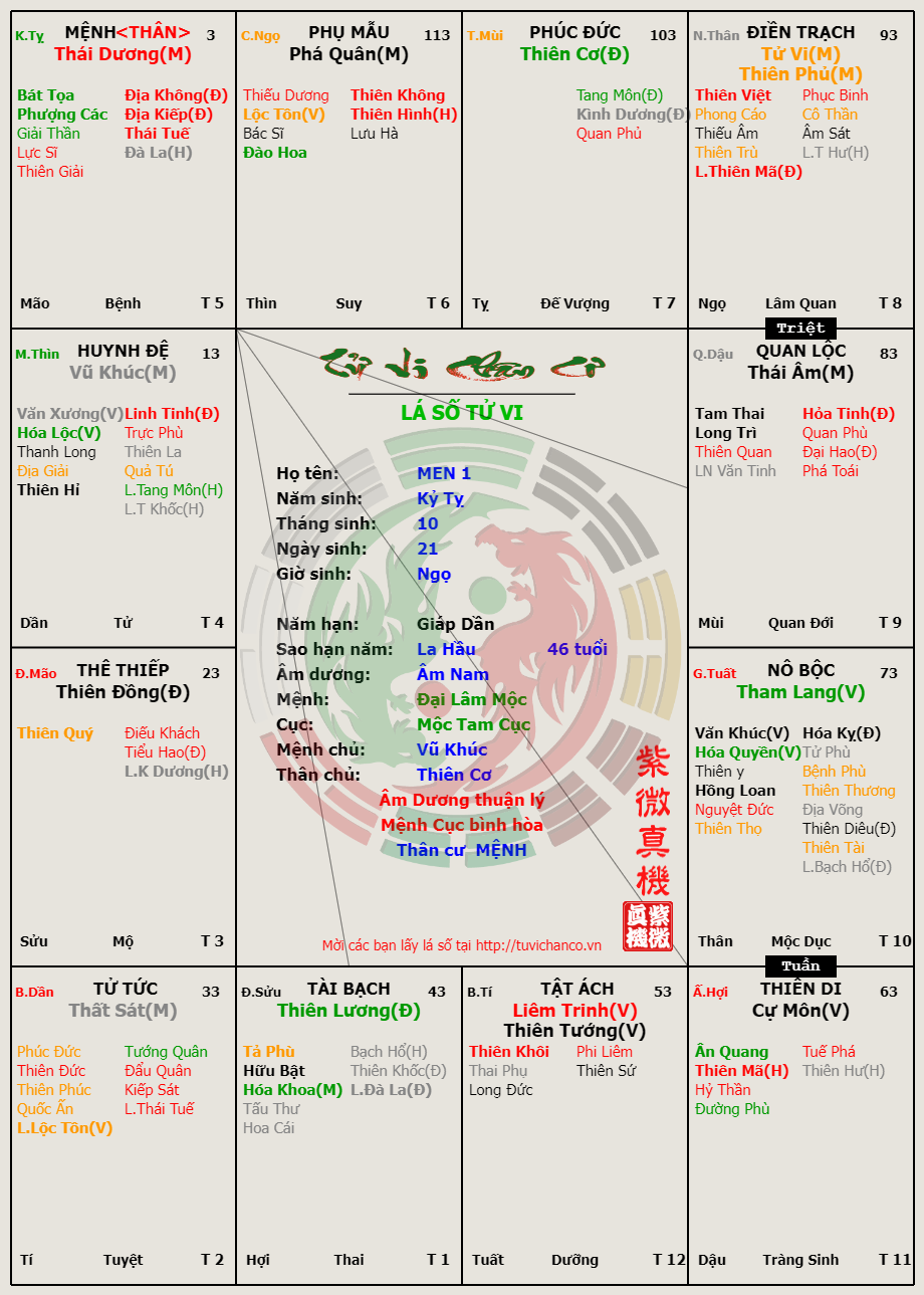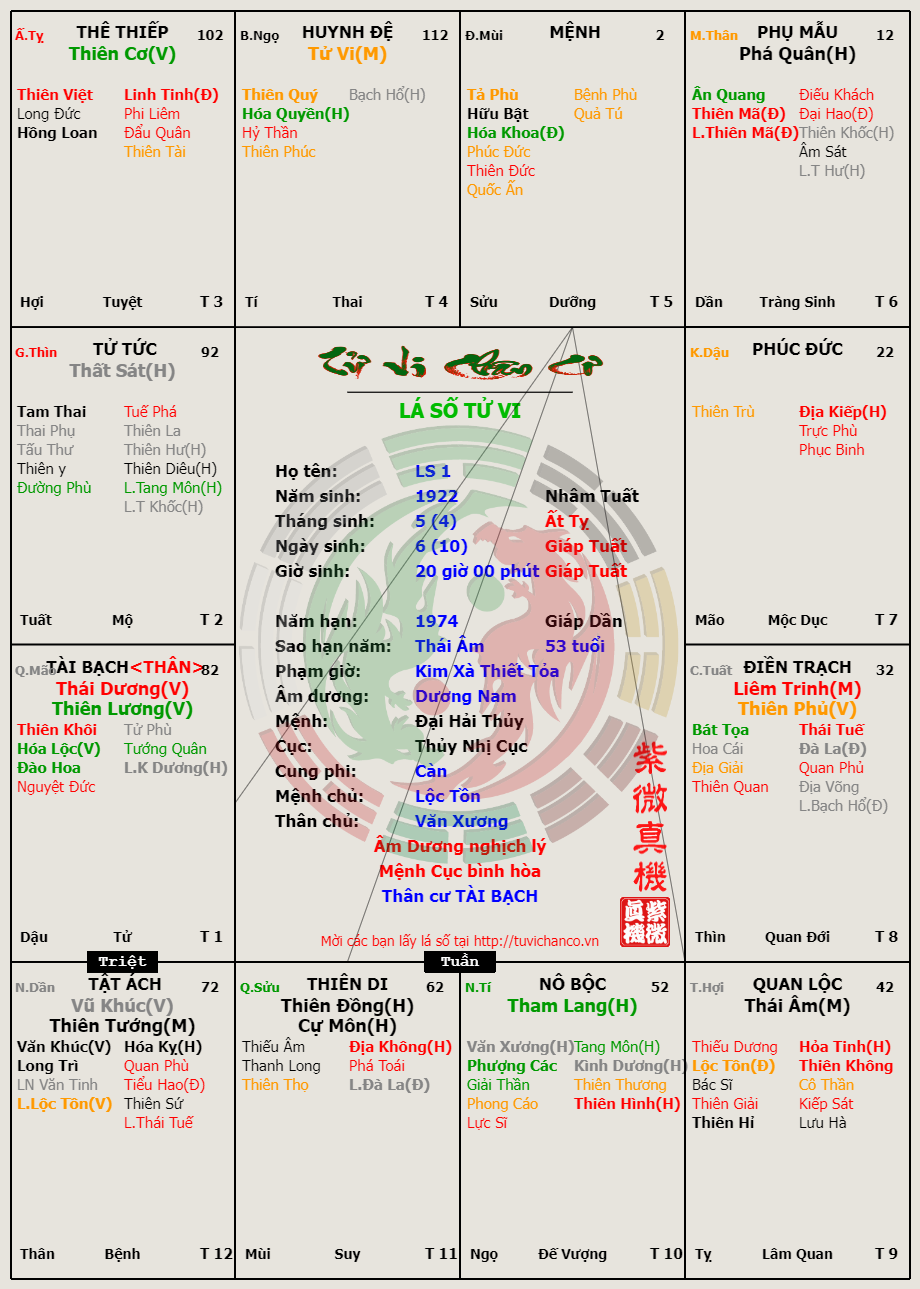 - Thưa ông, người này Tả Hữu thủ Mệnh tại Mùi, chung thân phúc hậu, đa năng, đa tài. Dáng người hơi đậm đà. Được tam hợp minh châu, mắt sáng, thanh kỳ. Nhất là Đào, Hỉ chiếu, da dẻ hồng hào, đẹp trai lắm. Vì có lưỡng Lộc tương hợp nên võ lược siêu quần lắm. Công danh rất sớm: 20 tuổi tức năm 1942 đã leo lên địa vị tột đỉnh, nhờ hành vi bất chính. Nhưng từ 20-30 tuổi Lương, Nhật, Đào, Hóa Lộc bị Triệt che lấp không giao huy được với Tả Hữu, Nguyệt, Lộc Tồn. Lại bị Không ở Thiên Di xung phá, nên không có thực quyền. Từ năm 30 tuổi trở đi, Không ở Thiên Di bị Tuần che lấp, mà Triệt giảm hoại nên Lương, Nhật, Đào, Hóa Lộc giao huy được với Tả Hữu, Nguyệt, Lộc Tồn nên vang danh bốn biển. Vị tới bậc Bá.