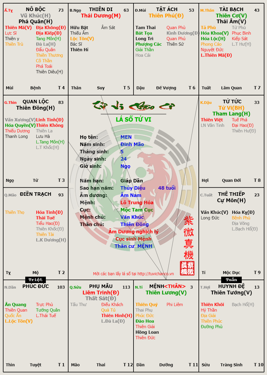 Tuổi Đinh Mão (1927), tháng 5, ngày 24, giờ Ngọ:
