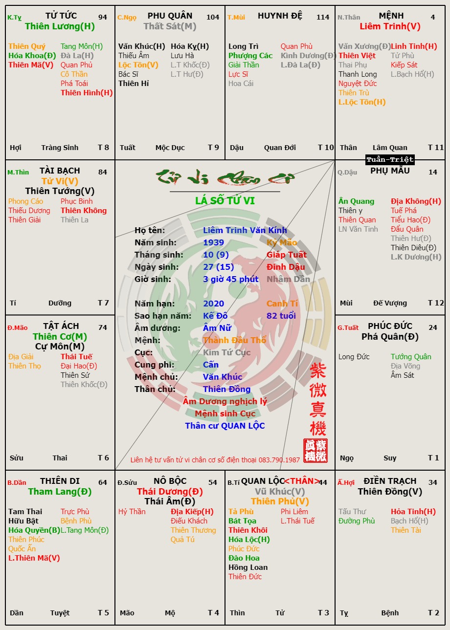 Lá số tham khảo cách "Tài và Tù cừu", người này đáng tiếc là một phụ nữ, bị hạn chế vì hoàn cảnh xã hội không có thể phát huy đành phải "Mắng chồng cho hả", do có Xương Khúc tương hội nên dù mắng chồng thì cũng "có bằng có chứng" mà không phải "chửi đổng", do đó có thể duy trì hôn nhân. Người này đem cách cục "Liêm Trinh văn võ" phát huy trong quan hệ vợ chồng, trong nhà "Nàng" mới là lão đại.