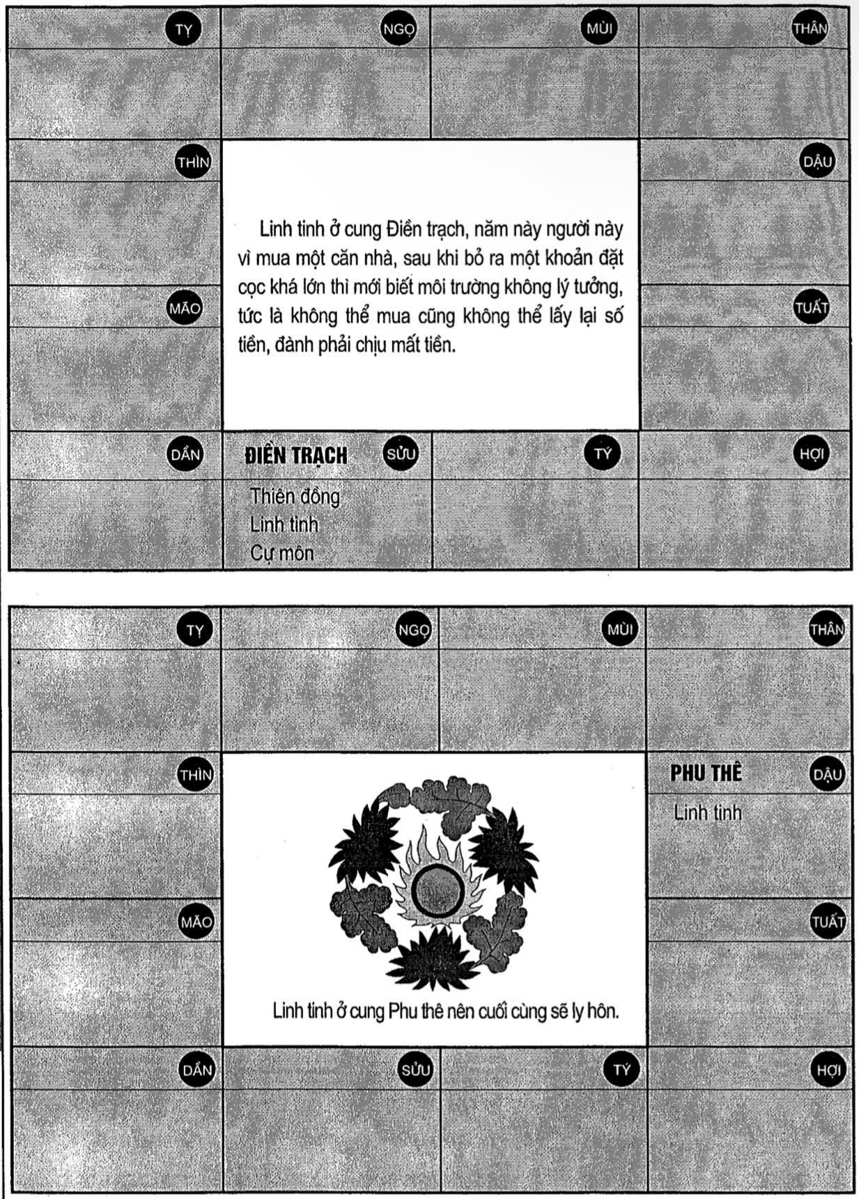 Ví dụ: Ở cung Điền Trạch, vậy thì người này sẽ vì bất động sản mà phải một phen điêu đứng; khi nó ở cung Phu Thê thì vợ chồng chia lìa, ở cung Tử Tức thì con cái bỏ đi biệt tích.