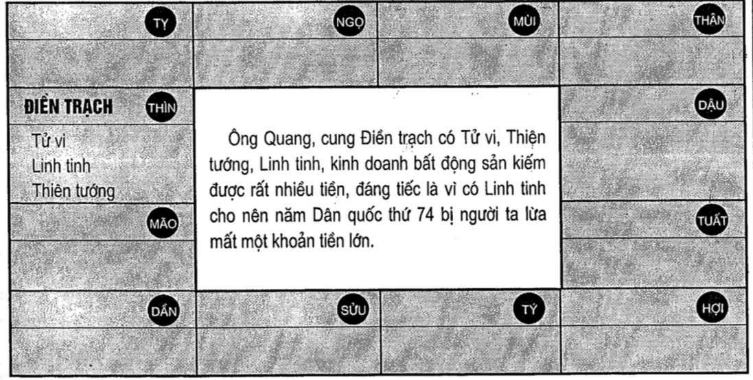 Như vậy, khi Linh Tinh ở cung nào thì cung đó rất xấu, chẳng hạn như ông Quang, cung Điền Trạch có Tử Vi, Thiên Hình, ông này năm ngoài 30 tuổi kinh doanh bất động sản, tích lũy dần dần cũng có được số vốn kha khá, đó cũng là số tiền mà ông chịu khổ chịu khó tích lũy mới có được. Nhưng ông không ngờ rằng năm nay đối tác đã lừa của ông mất một khoản tiền lớn. Ông Quang kinh doanh bất động sản đã 30 năm, kinh nghiệm có thừa, nhưng đáng tiếc "vỏ quýt dày có móng tay nhọn", tâm huyết mấy chục năm của ông chỉ trong 1 ngày đã thành tro bụi, suy cho cùng nguyên nhân không phải là tại ông mà là do trong cung có 1 "thần sát" - Linh Tinh gây nên.