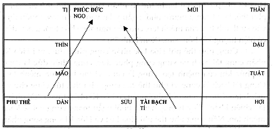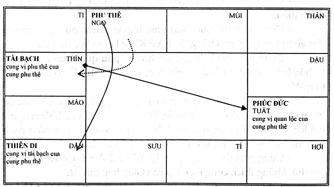 Cung phu thê phi Hóa Lộc nhập cung thiên di, phi Hóa Kị nhập cung tài bạch và xung cung phúc đức, cung thiên di là cung vị tài bạch của cung phu thê, tức Lộc nhập tam phương của cung phu thê, còn chiếu cung vị phúc đức của cung phu thê. Cung phu thê phi Hóa Kị nhập cung tài bạch, tức Kị nhập cung vị phu thê của cung phu thê, là ý tượng: người phối ngẫu ỷ lại vào mệnh tạo, muốn dựa vào sự thành tựu của mệnh tạo, cho nên người có hóa tượng này đều có hiện tượng kết hôn sớm. (Xem hình 1)
