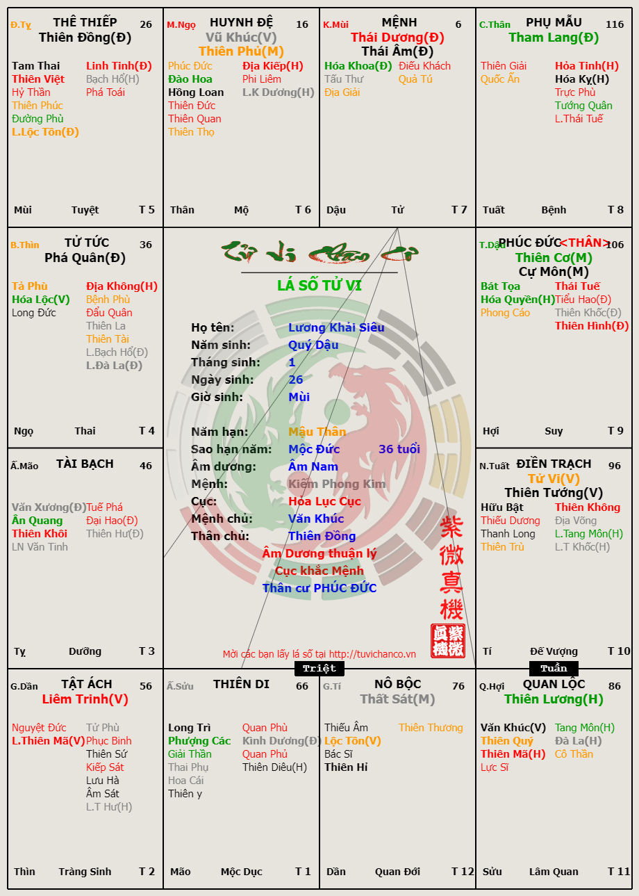 Người tuổi Dậu, Mệnh ở Mùi, Thân ở Dậu, biết ngày chí hướng chủ nhân không chấp nhận định mệnh tạo hóa an bài. Đối với tiên sinh định mệnh là một việc, còn cái "Tôi" không phải là bù nhìn nhất nhất tuân theo. Điều tôi nghĩ theo lương tâm phán quyết là phải, tôi phải làm, đó là cái quyền của tôi. Hóa Quyền ở Thân với Thái Tuế, Thiên Khốc là cái quyền đến cao sanh cũng không dễ dầu gì lấn đoạt, phải công nhận đó là cái quyền đương nhiên của danh nhân chính phái.