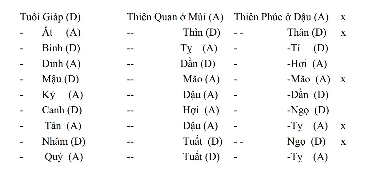 d) Tuổi Tân (A) đem phước lành (Lộc Tồn) ban phát cho 3 chi Tỵ, Dậu, Sửu, 3 cung này thường xuyên có Phá Toái lũng đoạn và Tân lại bị Triệt chặt đứt ở Tỵ, như tuổi Tân Tỵ ngoài Triệt ở Tỵ Lộc Tồn còn bị Tuần ngăn đón ở Dậu nên Quan Phúc phải ngồi ngay ở Dậu và Tỵ an ủi cho được phần nào.