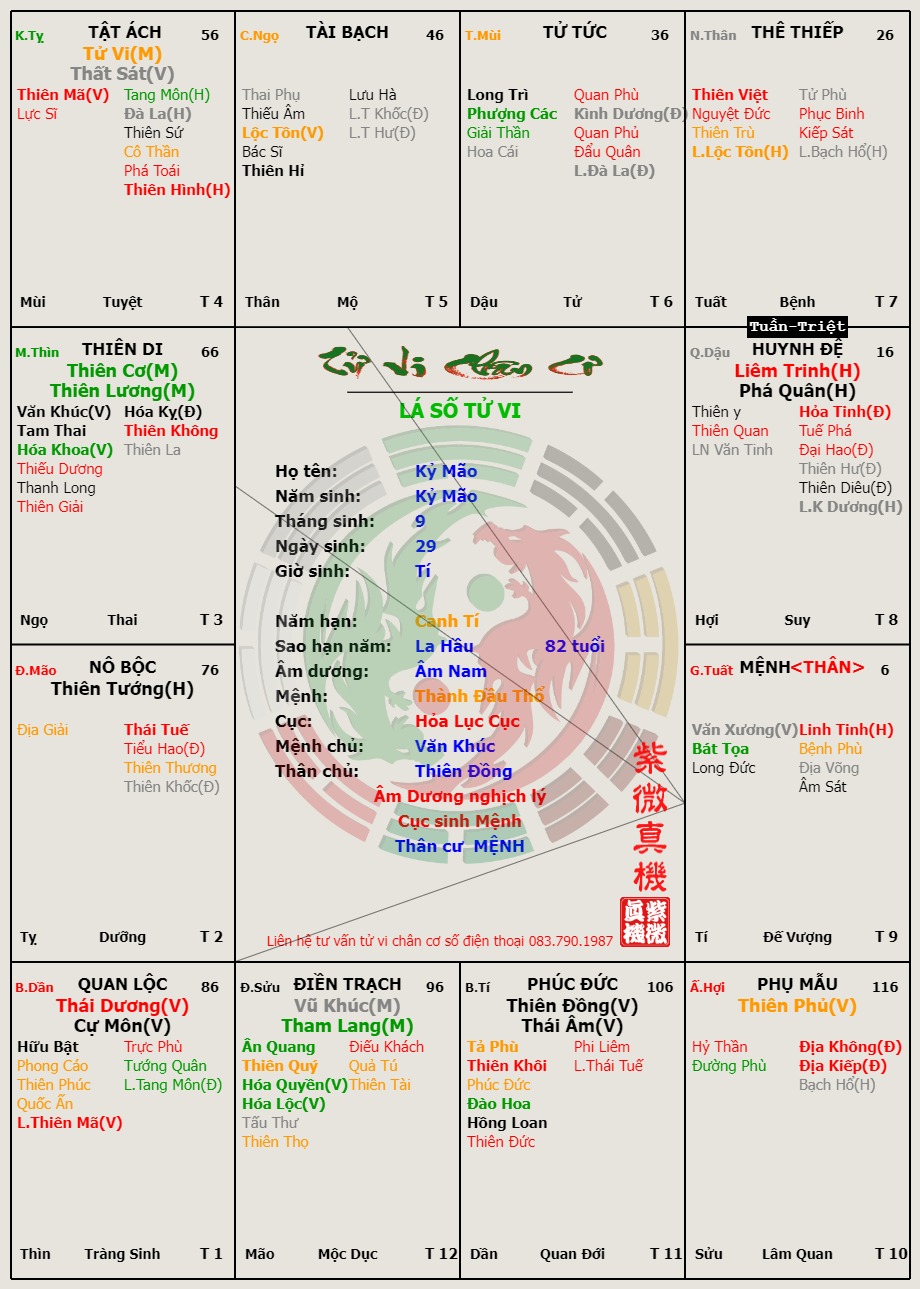 Số Kỷ Mão sanh ngày 29 tháng 9 giờ Tý, Mệnh Thân Vô Chính Diệu ở Tuất được Văn Xương (Kim đới Thổ làm điểm tựa, nhưng vì Linh Tinh nung nấu nên thân hình èo ọt ốm đau. Hợp với cách Cự Nhật, Hữu Bật, Thiên Phúc ở Dần (Quan) là người có khả năng luận lý xét đoán soi sáng giúp đời. Đứng vị trí Long Đức (thiệt thòi) là chỗ ngồi từ thiện vô vị lợi tử an ủi không phải là công lao nhỏ bé (Long Đức, tứ đức tựa Long Ngai).