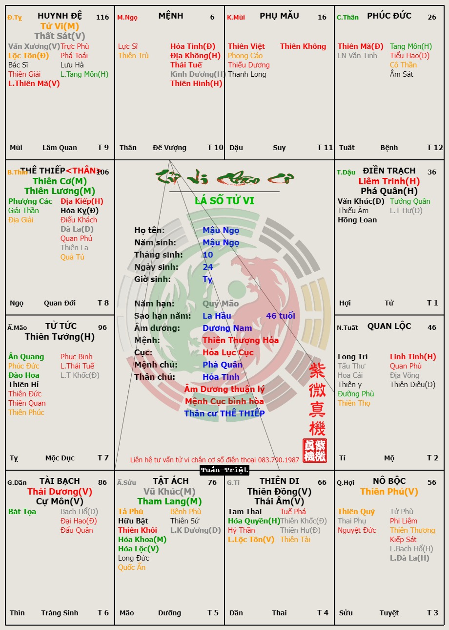 Số Mậu Ngọ sanh ngày 24 tháng 10 giờ Tỵ khiến người học số phải suy tư rất nhiều đâu là bộ mặt chính xác. Mệnh Thái Tuế Vô Chính Diệu, Thân Điếu Khách, Cơ Lương. Nơi đây có một dư âm lạm dụng cần phải nhận xét sao cho trúng mức. Người Mậu Ngọ, Hỏa mệnh không chính tinh, có Địa Không ở Mệnh, Thiên Không ở Phụ Mẫu nhị hợp sinh nhập cho Mệnh và Tuần ở Thiên Di hay nói Mệnh Vô Chính Diệu đắc Tam không phú quý khả kỳ (tốt). Sự thật không phải cứ Mệnh nào không chính tinh mà có 3 không cũng phú quý khả kỳ cả: vì không thuộc hành Hỏa, phải Mệnh Hỏa mới được dự trúng cách. Đây là đợt đầu tuyển lựa các thí sinh dự chung kết mà thôi.