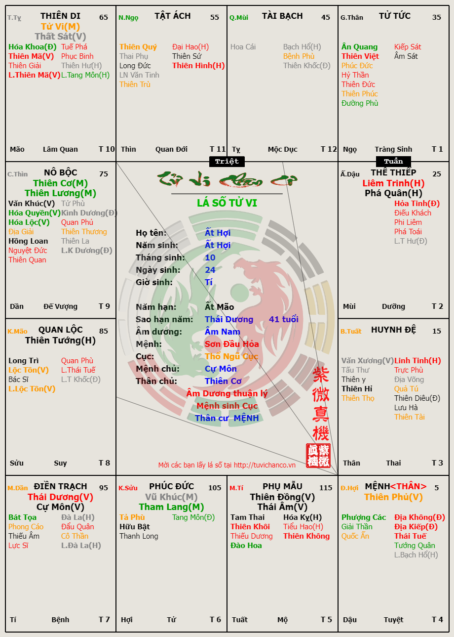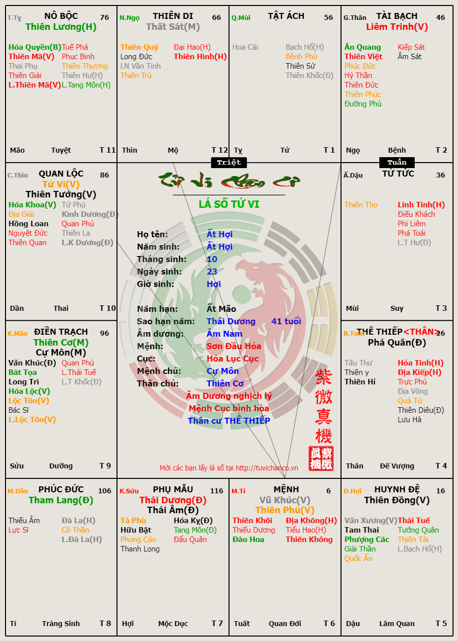 Mới đây, tôi có nhận được một lá số, tuổi Ất Hợi, sinh ngày 23, tháng 10, giờ Hợi, tự hỏi phải chăng đây là một nhân vật biết đặt quyền lợi chung lên trên tư dục, biết thực thi công bằng xã hội lên trên mọi bất bình cá nhân, dám làm những gì mà những người tiền nhiệm hay kế tiếp sau này không dám làm, và riêng đối với bản thân vẫn tự coi như là phận sự, không vụ lợi?