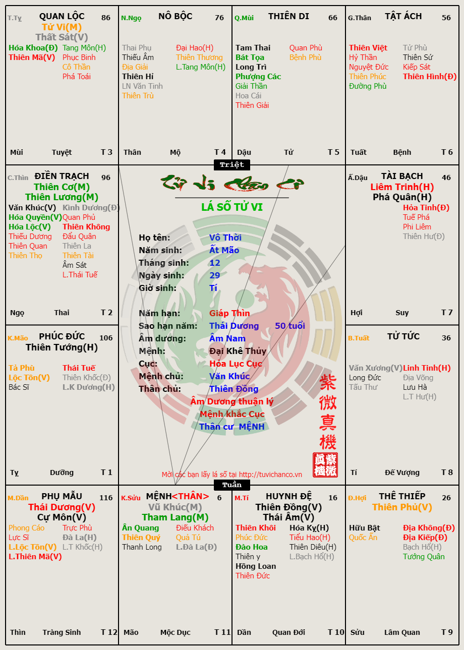 Nhưng đây là một lá số có thể liệt vào hạng đáng kể chỉ vì thời vận éo le nên không thành công trong ý muốn của mình, dù cố vật lộn dẻo dai kiên trì cách mấy cũng chỉ hoài công bất mãn như trường hợp tuổi Ất Mão sinh ngày 29 tháng Chạp giờ Tí do một vị độc giả KHHB yêu cầu phân tích.