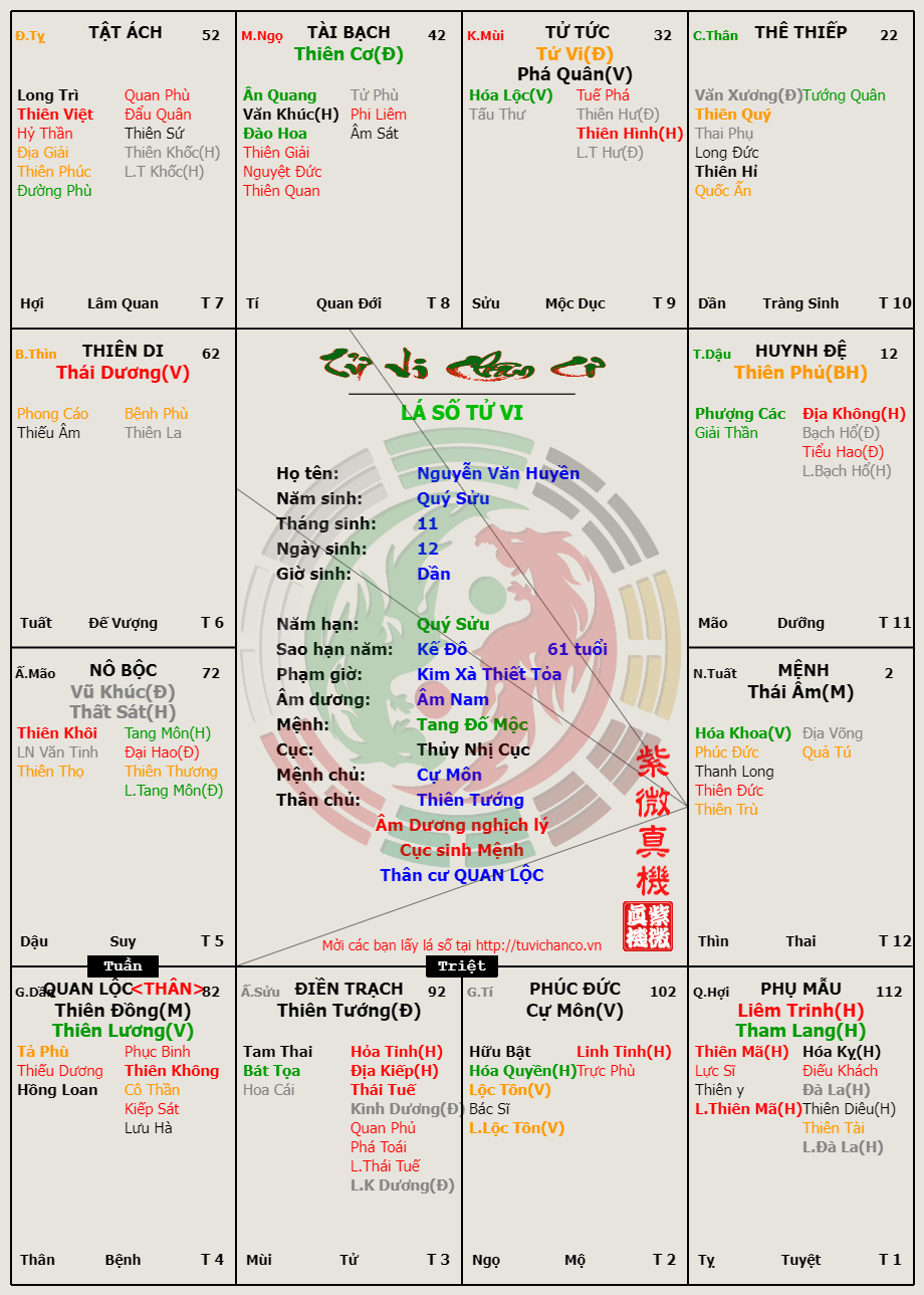 Lá số Tử Vi - Ông Nguyễn Văn Huyền