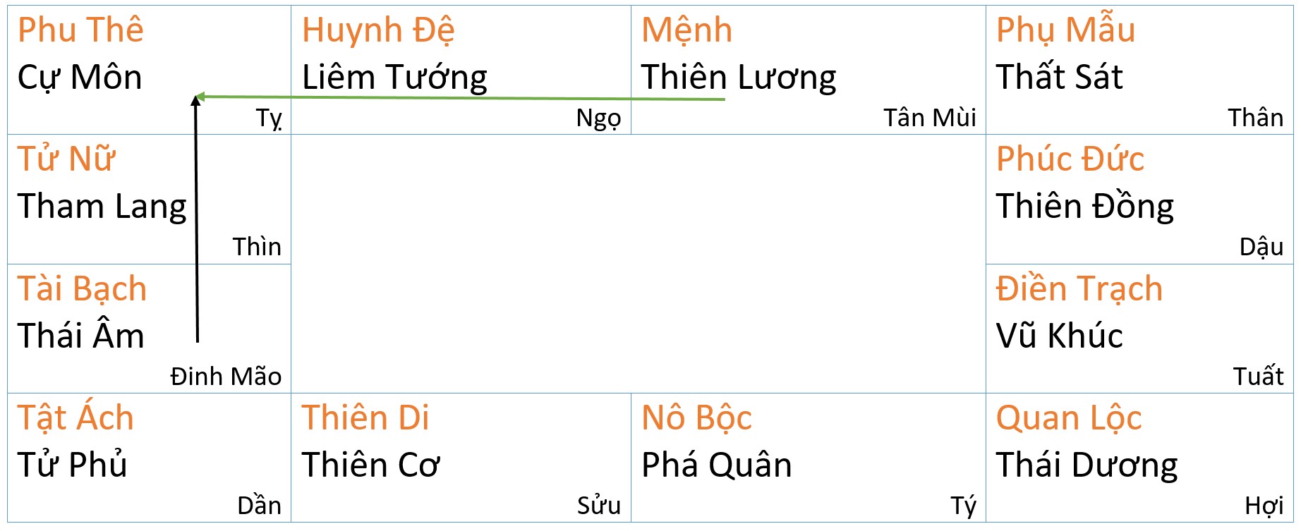 Cung mệnh phi Hóa Lộc nhập cung phu thê, là chủ về mệnh tạo yêu quý người phối ngẫu; cung tài bạch lại phi Hóa Kị nhập cung phu thê, là ý tượng: tiền kiếm được mệnh tạo đều giao hết cho người phối ngẫu.