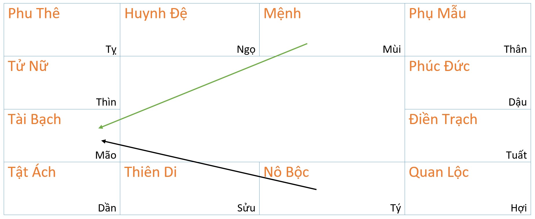 Cung mệnh, cung tài bạch và cung quan lộc là cung tam hợp, cung mệnh phi Hóa Lộc nhập cung tài bạch, là cung tam hợp phi hóa nhập cung tam hợp, cung tam hợp thuộc về “động", là ý tượng: tuy mệnh tạo rất biết kiếm tiền, nhưng kiếm được tiền hay không, còn chưa định. Cung nô bộc là “tha cung” lại phi Hóa Kị nhập cung tài bạch, cho nên trường hợp này cũng là hai cung khác nhau phi hóa, một cung phi Hóa Lộc, một cung phi Hóa Kị nhập vào cùng một cung, thành “Lộc Kị chiến khắc”; Lộc là “nhân”, còn Kị là “quả”, "Lộc đi theo Kị”. Vì cung nô bộc phi Hóa Kị là cung vị điền trạch của cung nô bộc, là ý tượng: mệnh tạo đi kiếm tiền nhập vào “kho” của bạn bè, đương nhiên là tượng hao tài.