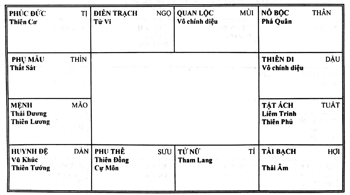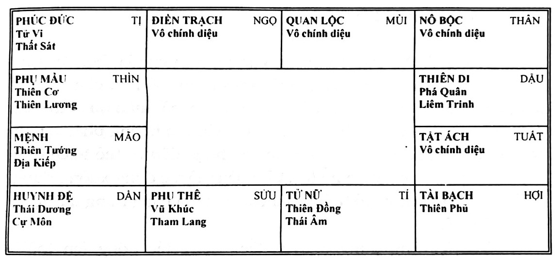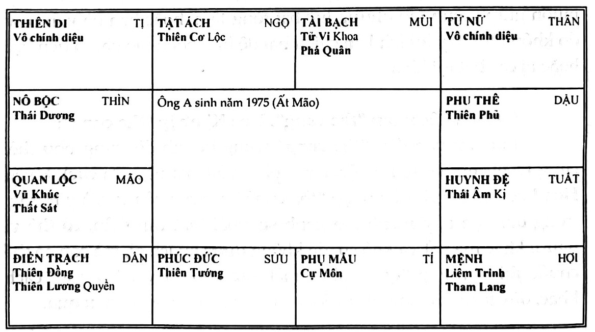 Mênh bàn của ông X là Thiên Tướng độc tọa thủ mệnh ở cung Mão, trong cung còn có Địa Kiếp, ông chìm nổi trên thương trường đã 20 năm. Lúc khốn đốn ông mắc nợ rất nhiều, để trốn nợ ông phải lang bạt sang nước Mĩ, Trung Quốc Đại Lục, đến nay không những đã trả hết nợ, mà công ti kinh doanh của ông còn làm ăn phát đạt ở Trung Quốc (xem hình 6).