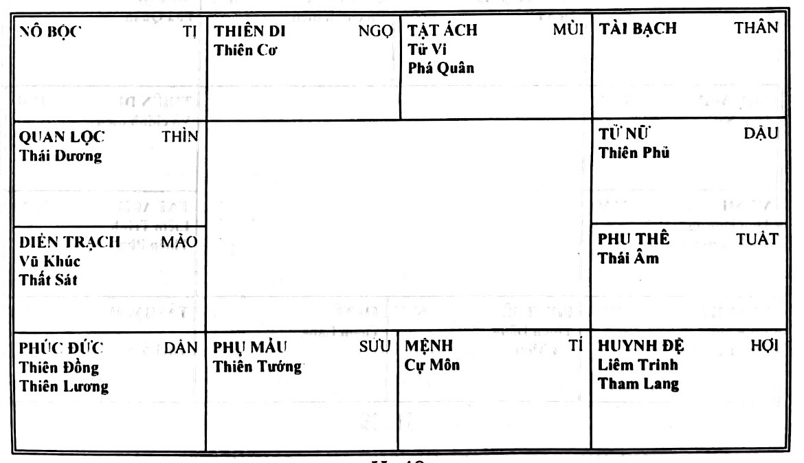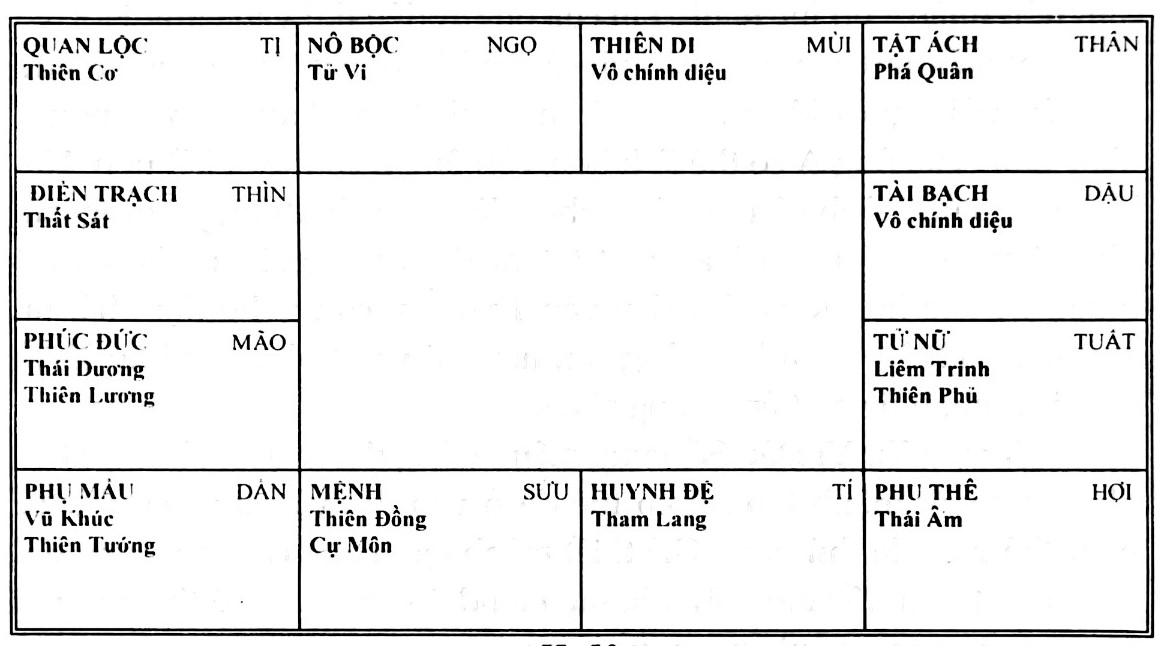 Ví dụ như ông A có “Liêm Trinh, Tham Lang” thủ mệnh ở cung Hợi, hành hạn đến cung Kỉ Mão; còn cô B có Cự Môn thủ mệnh ở cung Tí (xem hình 2), hành hạn đến cung Đinh Mão, hai trường hợp này có hiện tượng hoàn toàn khác nhau.
