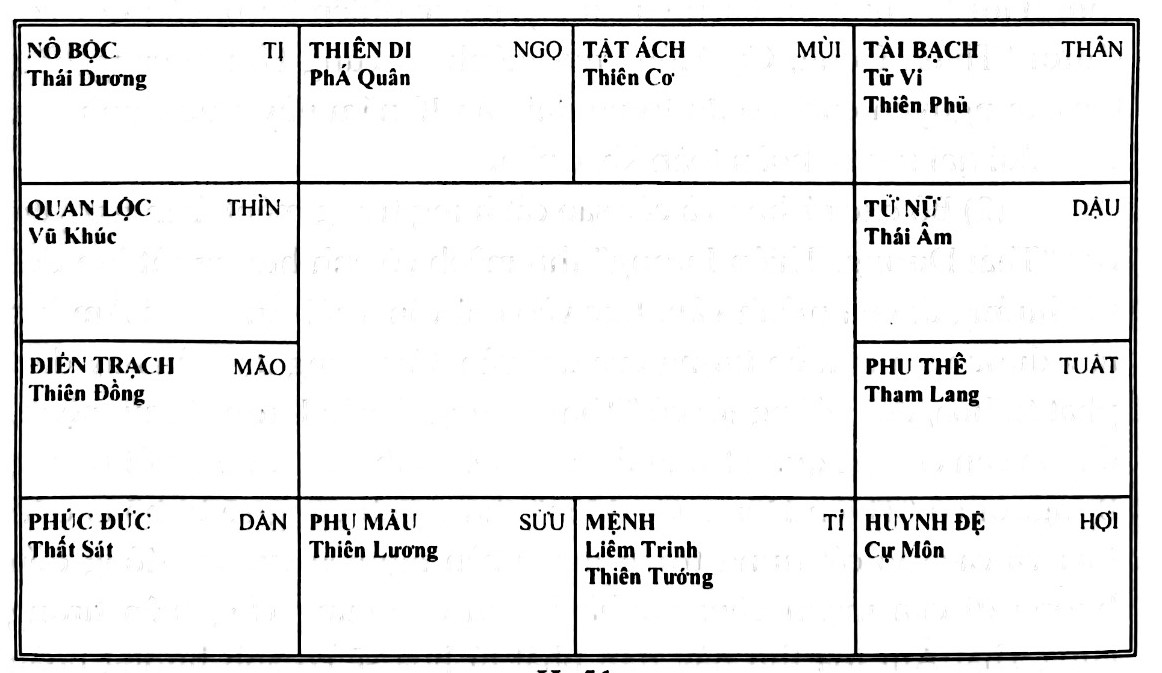 (1) Đối với người "Thái Dương, Thiên Lương" thủ mệnh, cung Hợi là cung tài bạch của nguyên cục (thiên bàn); còn đối với người "Thiên Đồng, Cự Môn” thủ mệnh thì cung Hợi là cung phu thê của nguyên cục; do đó trong đại vận 10 năm này trục chính của cuộc đời hai người hoàn toàn khác nhau.