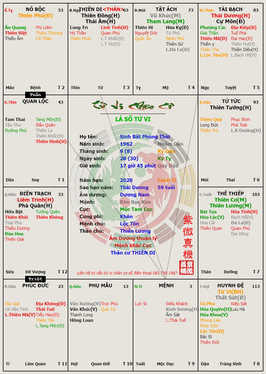 Lá số xem ở cách "Hùng túc triều viên", đây cũng là cách "Sinh bất phùng thời" nên mặc dù "dũng mãnh" có tiếng nhưng lại thành giang hồ đoạt địa bàn mãi nghệ. Dưới hoàn cảnh giai đoạn đó tha hương ở chợ đêm hoặc cửa miếu bày quầy bán hàng đều phải chào hỏi đầy đủ cấp bậc lễ nghĩa với đầu đảng giang hồ nơi đó để người ta không đi phá phách. Nhờ vào nắm đấm tranh quyền lợi, đè ép được địa đầu xà nên mọi việc đều thuận lợi. Tất cả đều dựa vào cái "Dũng mãnh dám làm" của người này, để nguời khác cũng sợ ba phần, đánh hạ ra cho gia tộc xưởng thuốc sinh ý, đến bây giờ vẫn còn hưng thịnh, đáng tiếc "Sinh bất phùng thời", nếu không chính là đại tướng quân "Uy chấn biên cương".
