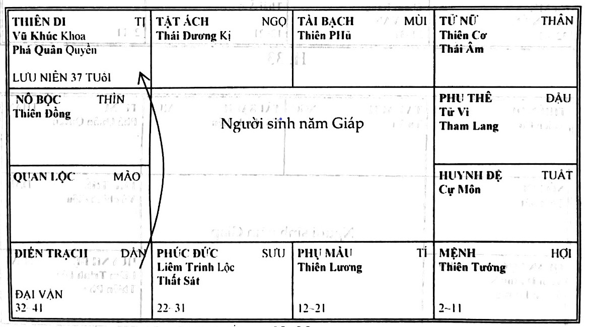 Trong đại vận (32~41), lưu niên 37 tuổi đến cung có Phá Quân Hóa Quyền [năm sinh], là năm này chủ về vất vả. (xem hình 5)