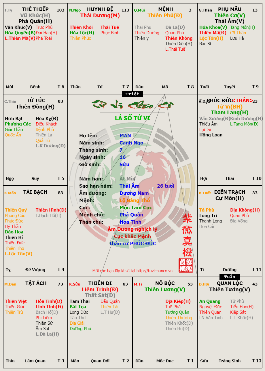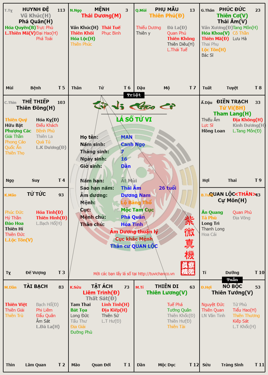 Mấy năm trước đây tôi được thấy số của 1 ông nhưng tôi cứ băn khoăn cố tìm hiểu tại sao với Đại vận 33-42 ở Dậu mà ông ấy lại đạt tới ngôi cao sang với nhiệm vụ đặc biệt quan trọng. Nhìn vào vị trí của Mệnh và Thân thì quả là ông là người có tâm huyết luôn luôn cho mình có bổn phận và trách nhiệm phải làm, mọi hành động có tính toán rất là chính đáng. Thái Dương, Thiên Khôi ngộ Triệt cũng thấy phần nào đúng với cặp mắt không phải là tròn xoe có phần nào nhỏ bé, đầu hơi thoa.