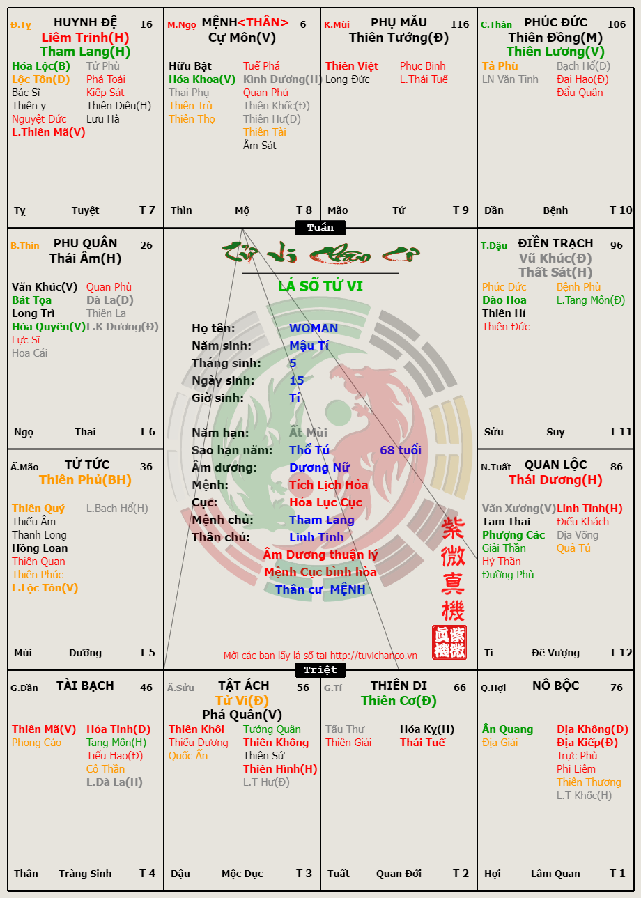 Dương Nữ Mậu Tí, sinh giờ Tí ngày 15-5: Thân Mệnh đồng cung tại Ngọ có Cự Tuần với nhiều hung tinh hội chiếu như Linh Hỏa, Kình Kị, Khốc Hư, Tang Điếu, nhất là Kình Dương tại Ngọ gặp Linh Hỏa hội chiếu chủ về bất đắc kỳ tử. Đại hạn 26-35 tại Thìn (hạn La Võng Nhật Nguyệt hãm gặp Linh Kị Đà, Bạch Hổ, Tử), lưu niên 27 tuổi tại cung Tuất cũng bị cách Nhật Nguyệt hãm La Võng, Kình Đà, Linh Hỏa, Tang Điếu, Khốc Hư, Tuế Phá. Tiểu hạn năm Dần gặp Tang Môn lưu, trùng phùng Tang Hổ, Hỏa Kị Đà lại thêm sao Tử. Bao nhiêu sao hung sát dồn lại ở các cung Mệnh, Thân, Đại Tiểu hạn, Phúc Đức nên làm sao thoát khỏi ách tử thần.