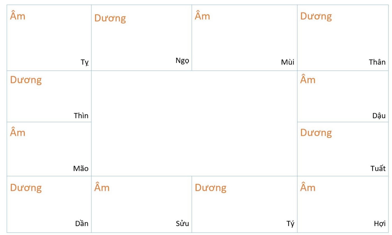 - Ngoài ra các tên địa chi vừa kể đi cặp đôi, chữ đầu là Dương và chữ sau là Âm, Tí là Dương, Sửu là Âm...