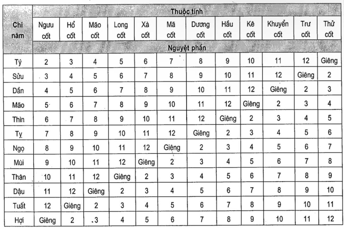 Bảng thuộc tính cốt cách dựa theo tháng và niên chi (tuổi)