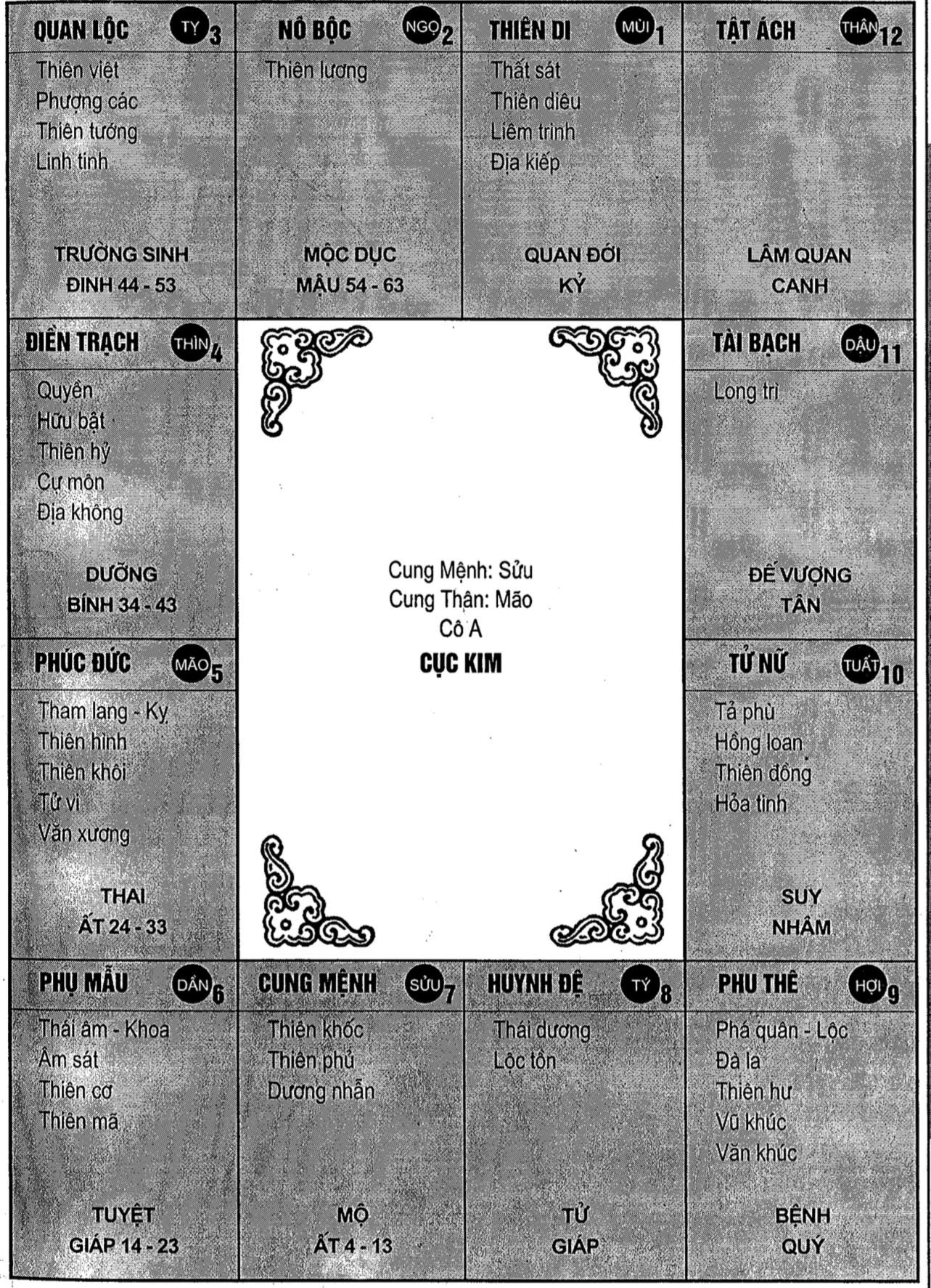Cung Phu Thê tại Hợi thì cung Quan Lộc của chồng cô ấy tại Mão, Tứ Hóa là Tử Vi, Tham Lang, Văn Khúc, Thiên Khôi, có thể biết chồng cô A bên ngoài hào nhoáng mà bên trong rỗng tuếch nhưng lại rất có tài hoa.