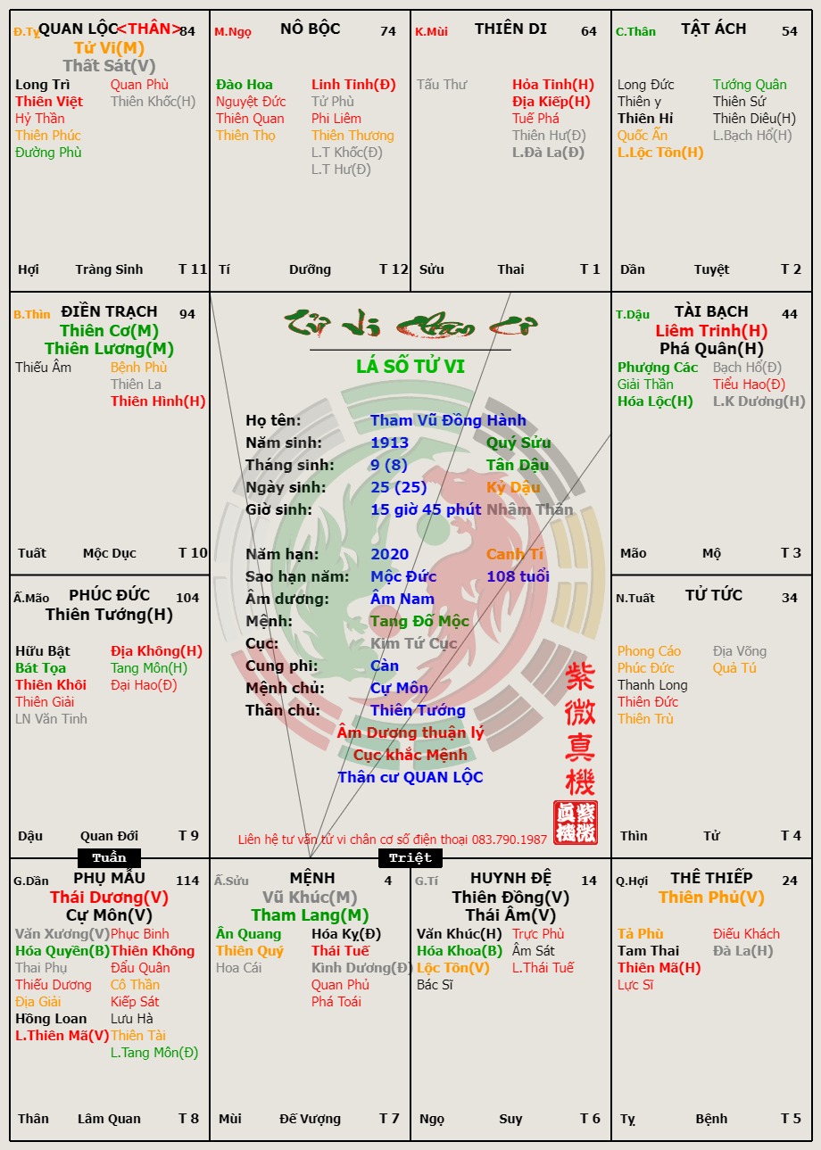 Cung Mệnh tọa Tham Lang - Hóa Kỵ tinh lại gặp Kình Dương, do đó khi còn nhỏ khốn đốn, "sơ vận gia cảnh bình thường, bố mẹ duyên mỏng, tặng người làm con nuôi", đã tặng người làm con nuôi là không cách nào kế thừa tổ nghiệp cũng đại biểu "Vũ Tham không phát thiếu niên", có rất nhiều ví dụ về làm con nuôi đều là rời xa cố hương, ở nơi khác bám rễ sinh chồi, lá số này không nói rõ ràng nhưng sự thật là làm con nuôi người khác phù hợp mệnh cách. Vũ Khúc, Tham Lang - Hóa Kỵ gặp Kình Dương miếu vượng, để người này trong khó khǎn gian khổ kích động tâm chí ngược lại trở thành đấu chí kinh doanh sau này. Nguời có cách Vũ Tham vốn có vận khí cường liệt sáng tạo tài phú, mà lại giỏi về luồn cúi, do đó "đến tuổi trung niên thì sáng lập nhà máy, công việc thịnh vượng đại phát tài lợi", mà Kỵ năm sinh tại cung Mệnh tuy khiến người này khi còn nhỏ khốn đốn nhưng cũng làm anh ta trở nên tốt bụng, từ tâm, vì thế khi thành công lúc nào cũng quyên tiền cứu tế, nhân từ tích đức, đối xử mọi người trung thành, thường quyên trợ giúp xã hội tế bần hoặc cống hiến nhiều cho giáo dục ". Người nói "Âm đức trăm năm" này khiến sát kị đồng cung Mệnh suy vi, người này làm con nuôi đã dời rễ đổi lá, được trùng sinh, sự nghiệp có thành tựu, lại hiểu được kính dâng, trợ giúp tộc đàn yếu thế trong xã hội, nhân từ tích đức, do đó Phúc Thọ kéo dài.
