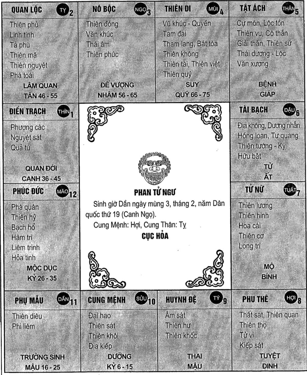 Phan Tử Ngư có Thiên Hình tại Tuất, như vậy cung Quan Lộc sẽ tại Dần (chú ý: ở đây là chỉ cung Quan Lộc của Thiên Hình, không phải là cung Quan Lộc của bản Mệnh), can cung là Mậu, Tứ Hóa là Tham, Âm, Hữu, Cơ. Thiên Cơ - Hóa Kỵ ở cung Tử Tức (không ở cung Điền Trạch), cho nên không bị tai họa ngồi tù.