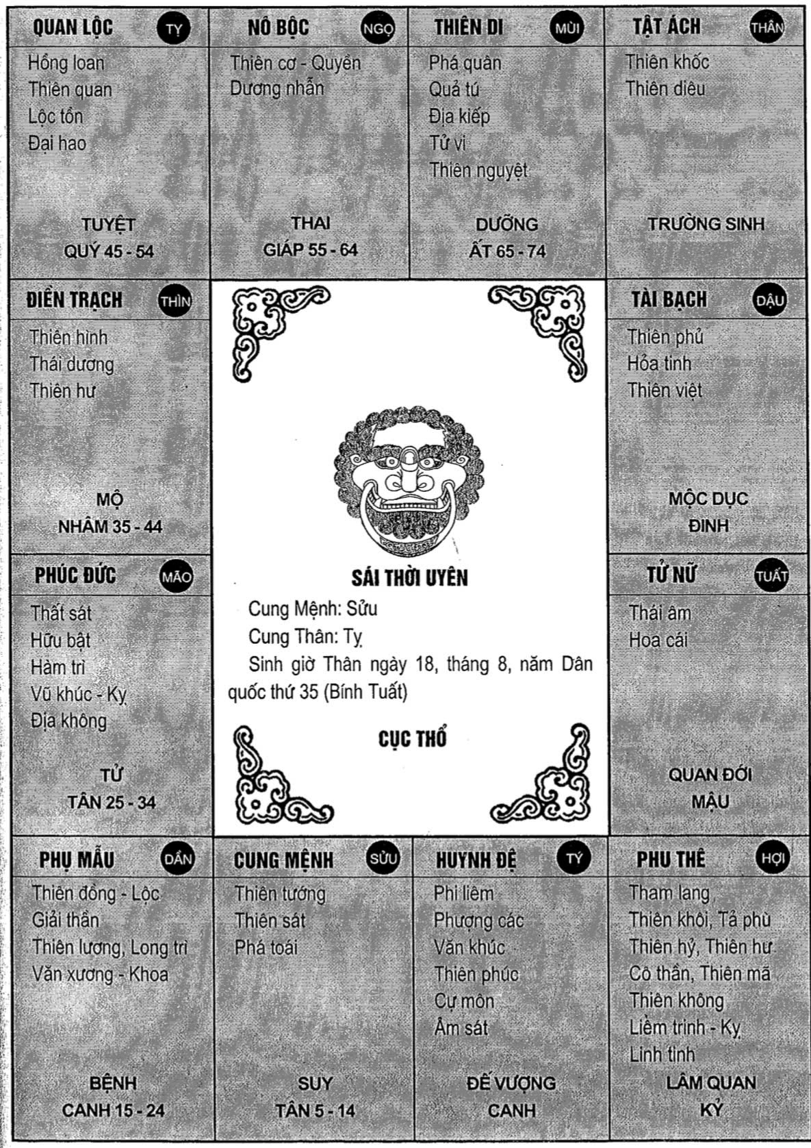 Sái Thời Uyên có Thiên Hình tại Nhâm, cung Quan Lộc tại Thân, can cung là Bính, Tứ Hóa của Bính là Đồng, Cơ, Xương, Liêm. Liêm Trinh - Hóa Kỵ nhập cung Phu Thê, vợ chồng duyên phận bạc bẽo, lại xung với cung Quan Lộc, cho nên gặp họa lao tù.