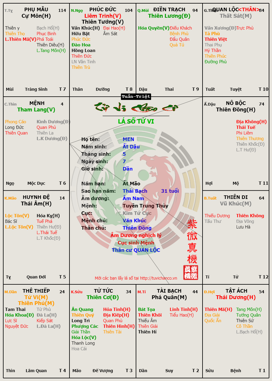 Để các bạn tiện tìm hiểu thêm về trường hợp này tôi xin nêu ra năm, tháng, ngày, giờ của lá số trên: đương số sinh ngày 7, tháng 5, năm Ất Dậu, giờ Dần, Âm Nam, Mệnh Thủy, Kim Tứ Cục.